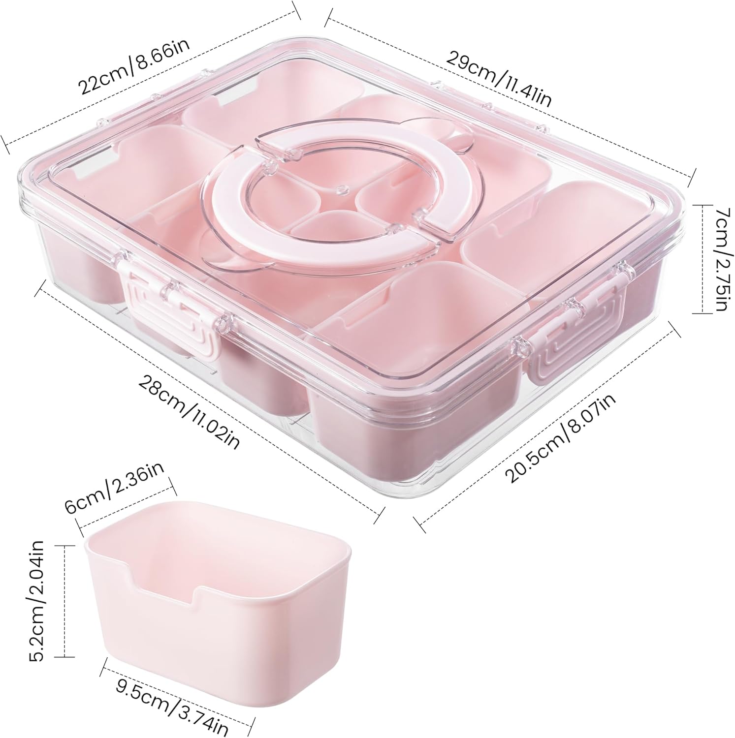 - 8 Removable Compartments :The transparent design of this Container allows you to easily view and access your snacks, keeping them fresh and neatly organized,The clear lid features 4 secure latches and a sealing silicone ring to keep your snacks fresh and prevent spills.