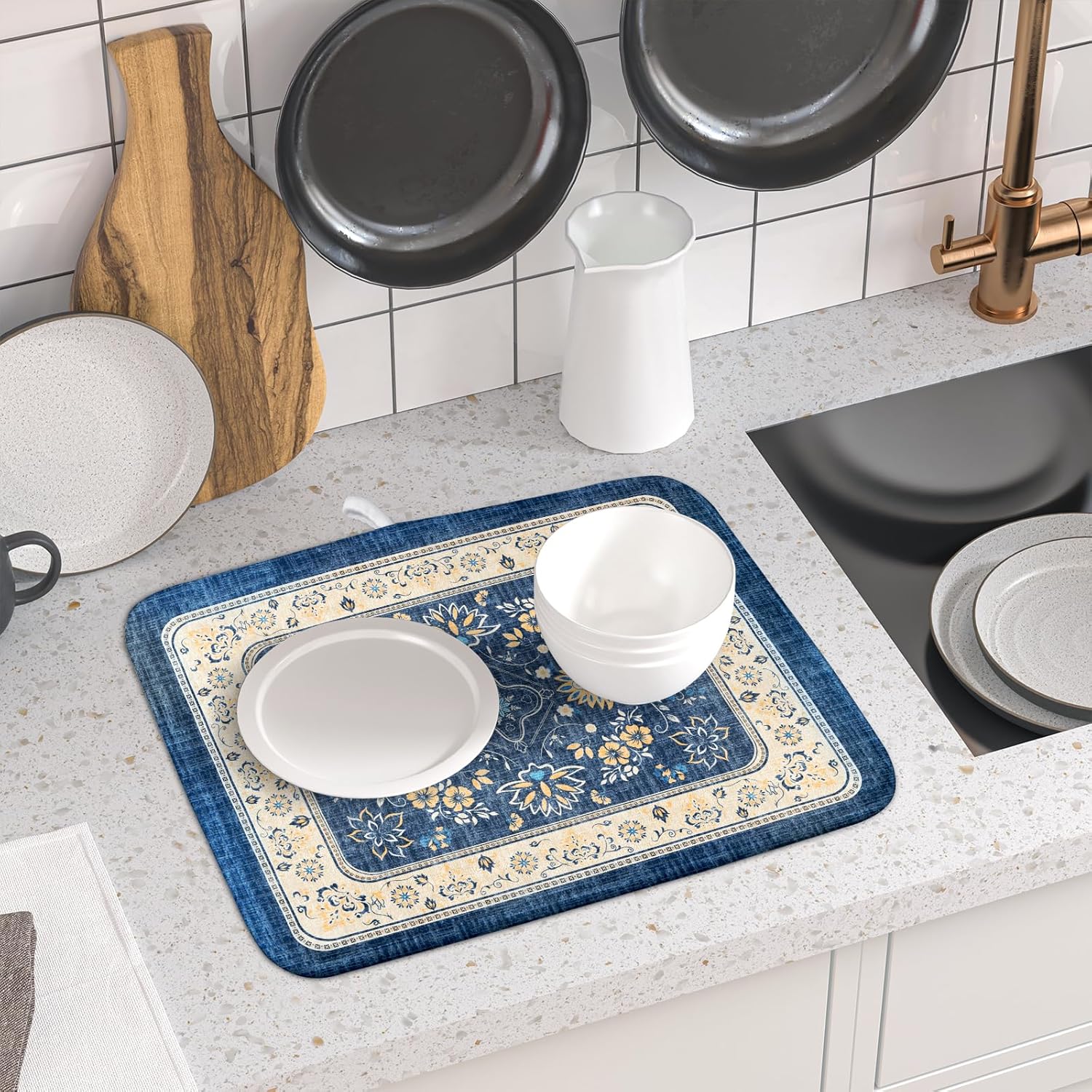 - 【Protect Tableware】Place your dishes on it or under dish racks, the bohemian flower dish mat prevents bowls, glassware, and more tablewares from being scratched or worn, can be used as dish drying mat, sink mat, dishes drainer mats to keep the countertop dry and tidy.