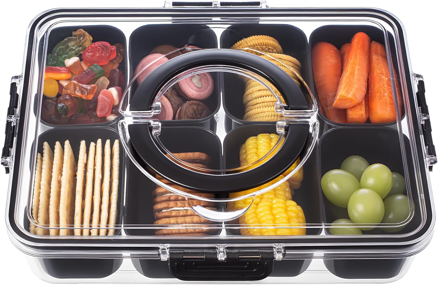 Divided Serving Tray with Lid and Handle - Snackle Box Charcuterie Container for Portable Snack Platters Organizer for Candy, Fruits, Nuts, Snacks - Perfect for Party, Entertaining, Black