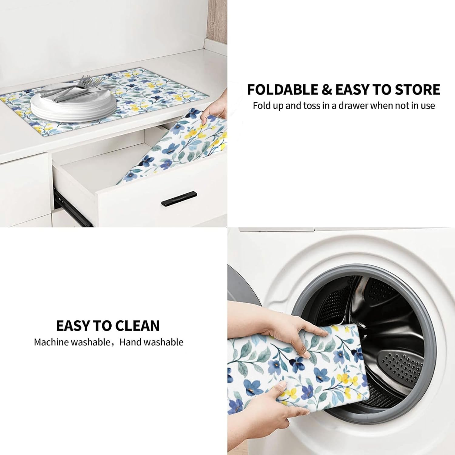 Floral Dish Drying Mat 18x24 for Kitchen Counter, Blue Yellow Flower Decorative Absorbent Coffee Mat Dish Drying Pad Coffee Bar Dish Drainer Rack Mat Drainer Mat
