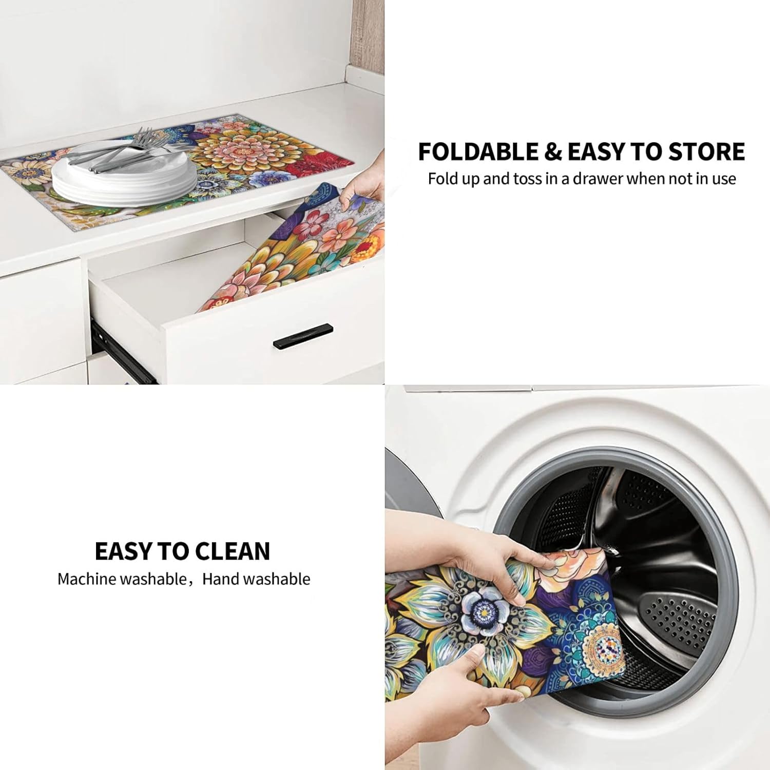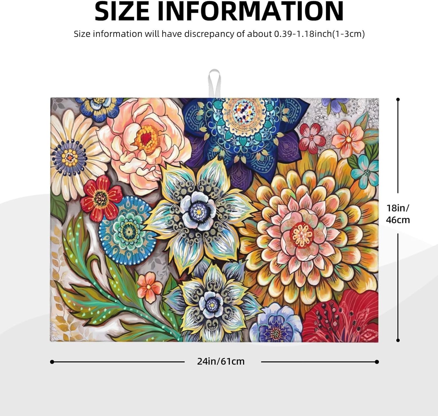 Floral Dish Drying Mat 18x24 for Kitchen Counter, Boho Coloful Flowers Decorative Absorbent Coffee Mat Dish Drying Pad Coffee Bar Dish Drainer Rack Mat Drainer Mat