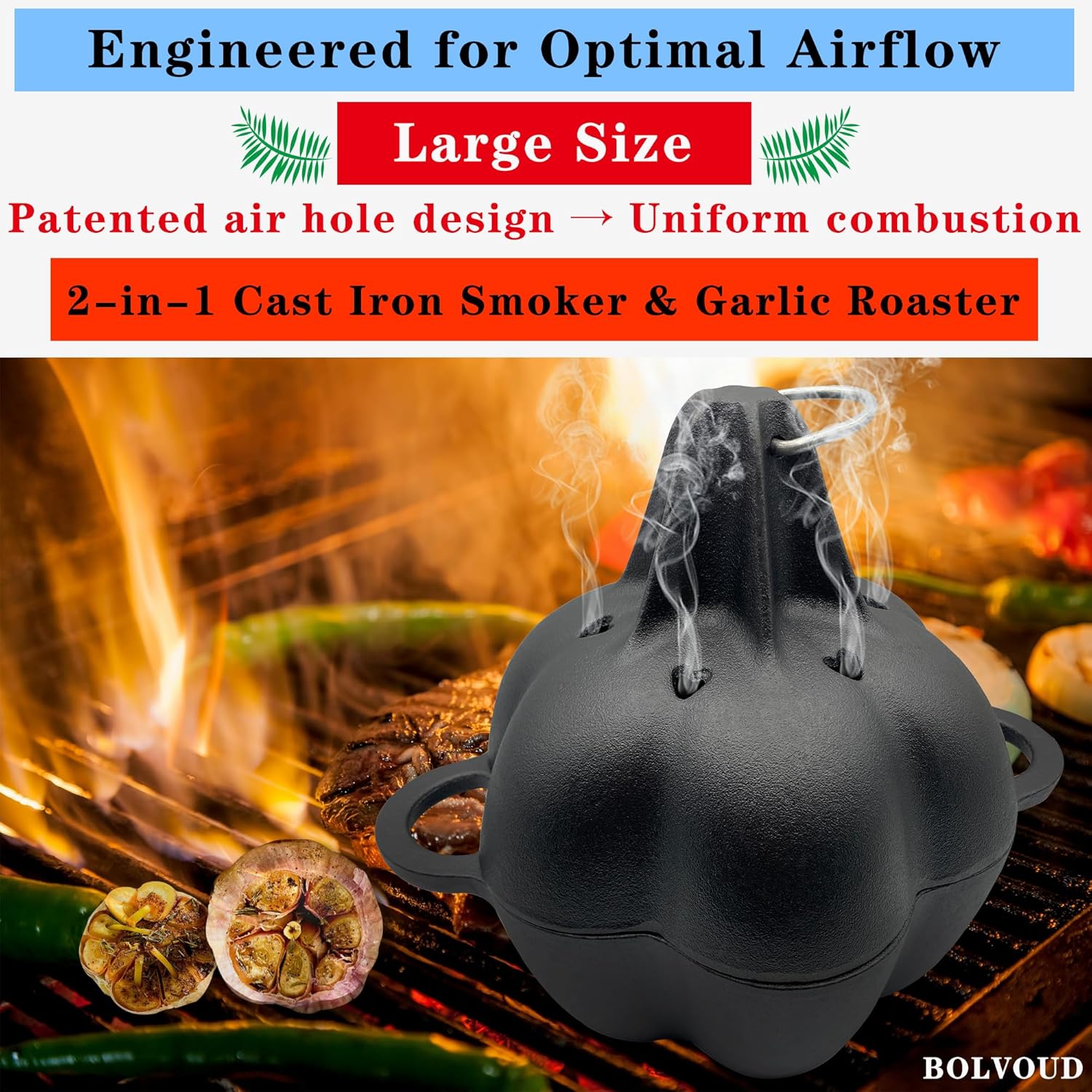 - ❤【Versatile Kitchen Must-Have】 Beyond being a smoker and garlic roasters, this cast iron creation can also handle roasting chicken, meats, and other veggies. It's a versatile must-have for kitchen and BBQ enthusiasts.