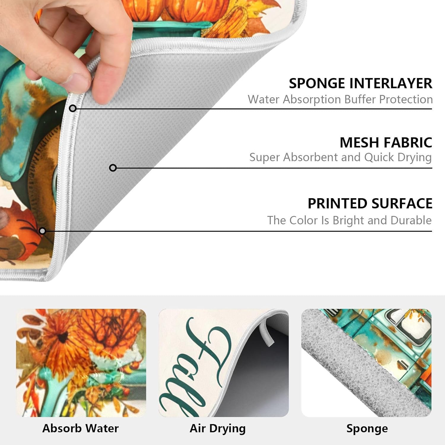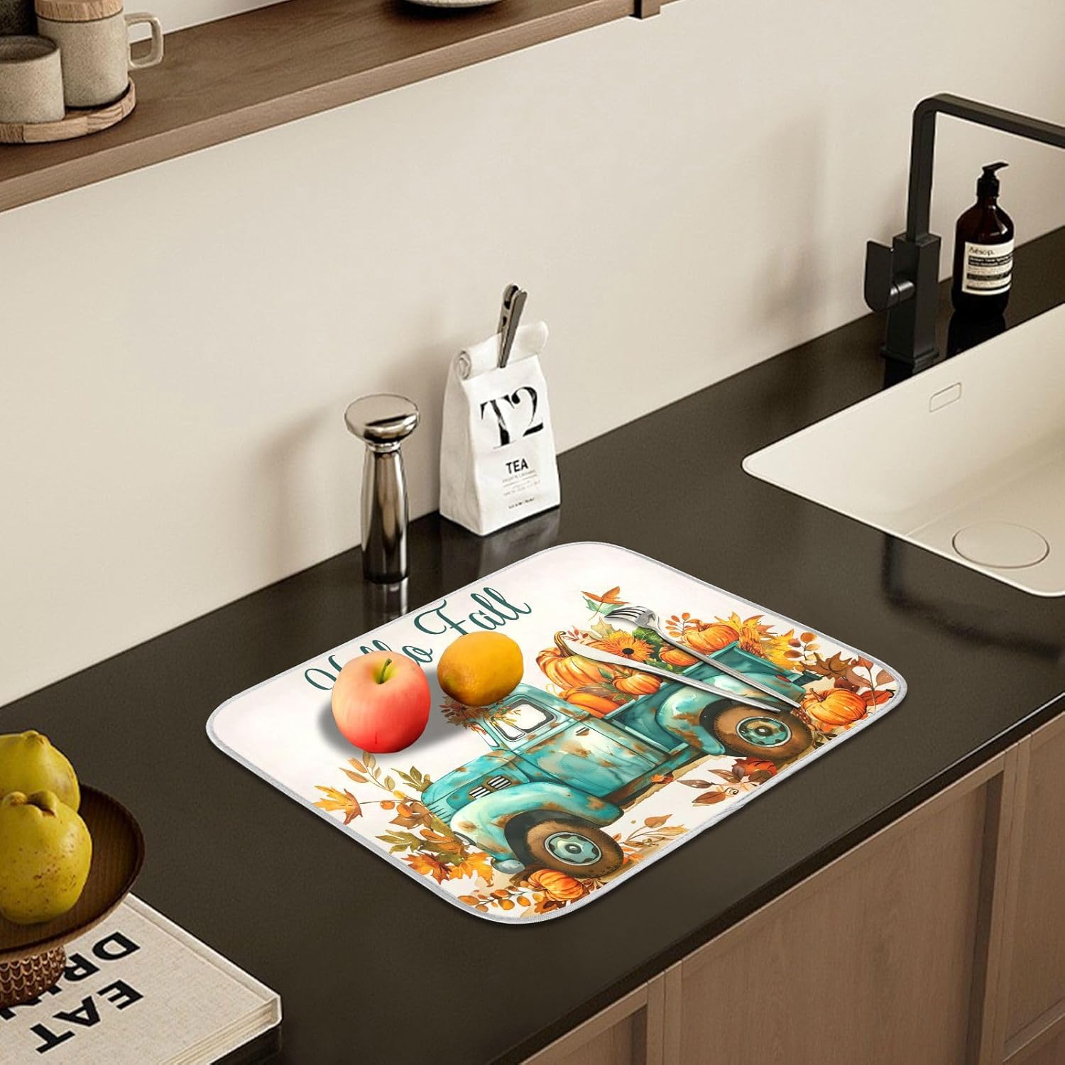 Vintage Fall Truck with Pumpkins Autumn Leaves Dish Drying Mat for Kitchen Counter Absorbent Microfiber Small Drying Pad Dish Mats for Kitchen Countertops 16 x 18 Inch