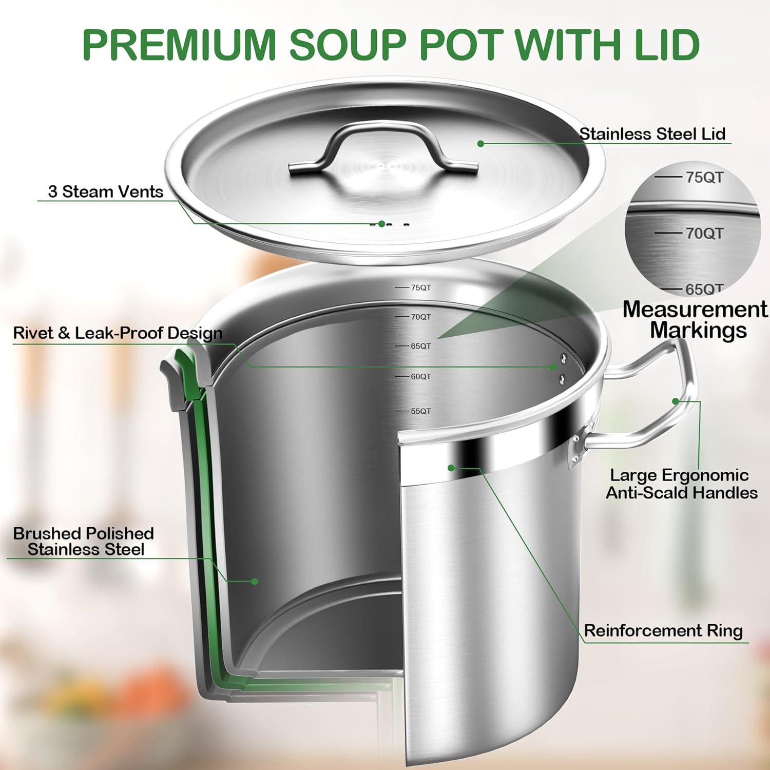 - [ANTI-OVERFLOW, SAFER] The large soup pot is equipped with a concave and tightly fitting stainless steel lid to prevent soup from overflowing. Three steam holes release air pressure to avoid scalding when you open the lid. The upgraded thickness and the reinforced ring on the top of the pot body make it safer to use.
