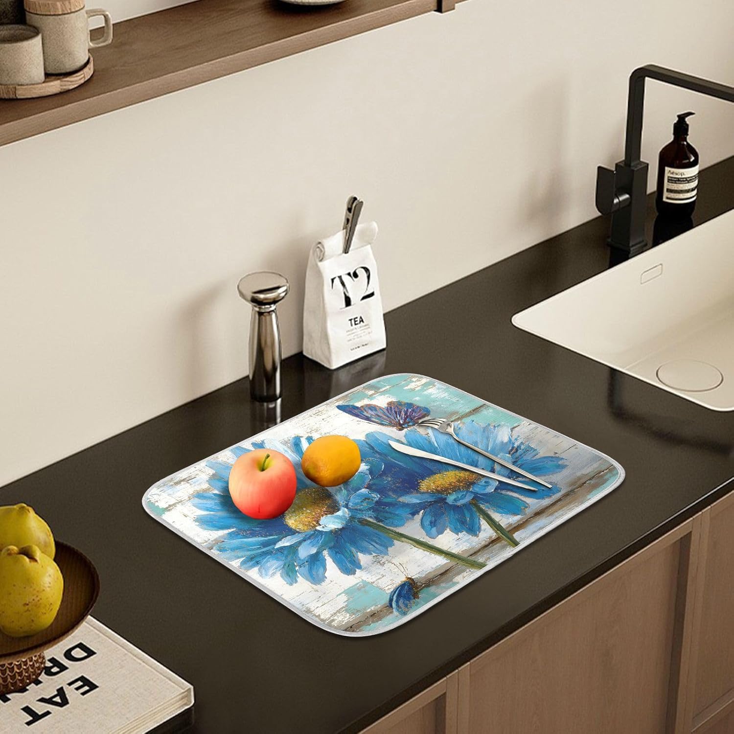 Rustic Daisy Blue on Vintage Wooden Dish Drying Mat for Kitchen Counter Absorbent Microfiber Large Drying Pad Dish mats for Kitchen Countertops 18 x 24 Inch