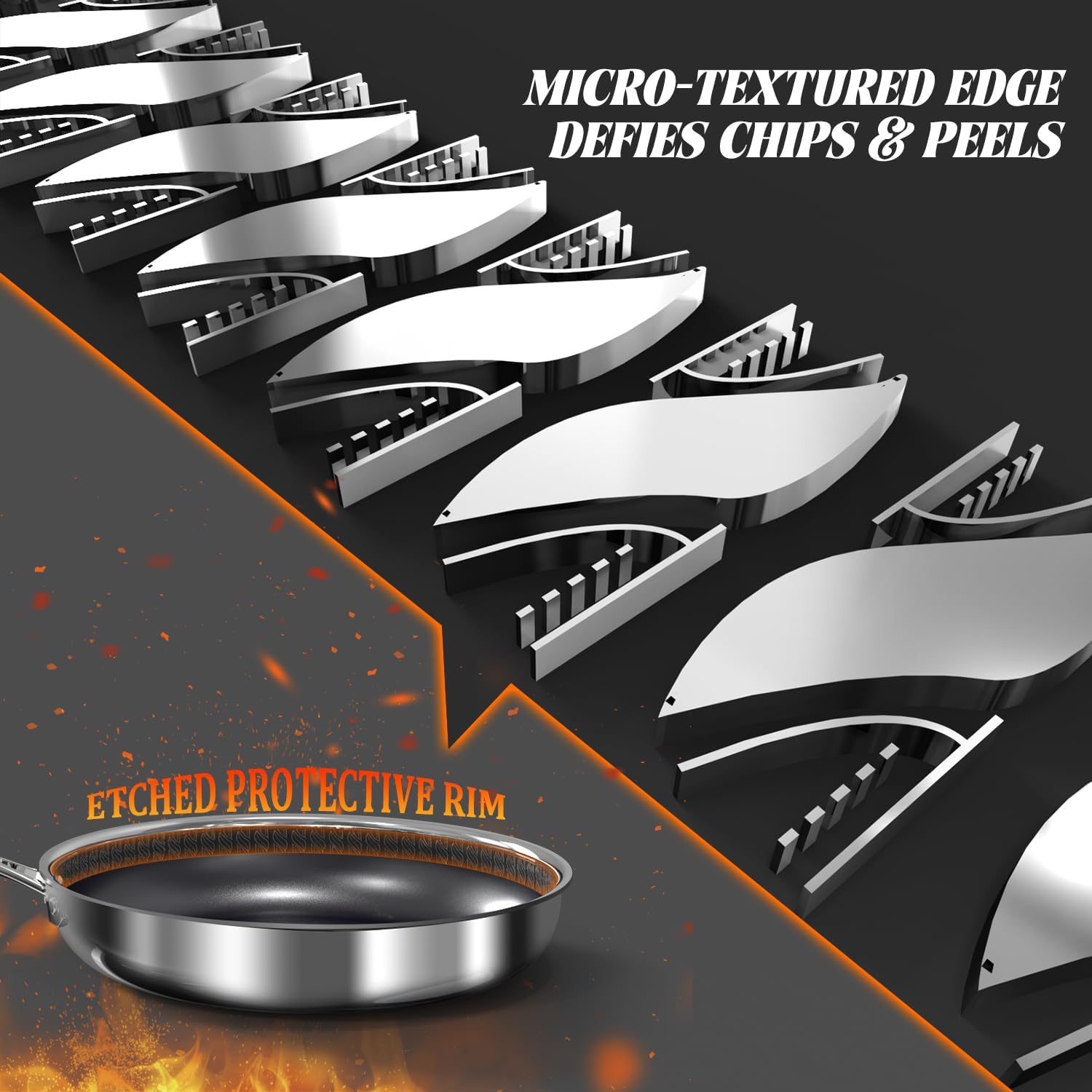 - Durashield Etched Rim: Featuring our exclusive etched stainless steel inner ring, this ceramic frying pan is engineered to resist edge chipping. By subtly raising the stainless steel above the coating it creates a protective buffer zone against accidental utensil bumps and scrapes. This makes the edge up to 2X more durable, preventing chips or peels for long-lasting performance. Precision micro-etching boosts surface friction by 20%, reducing food escapes while you toss