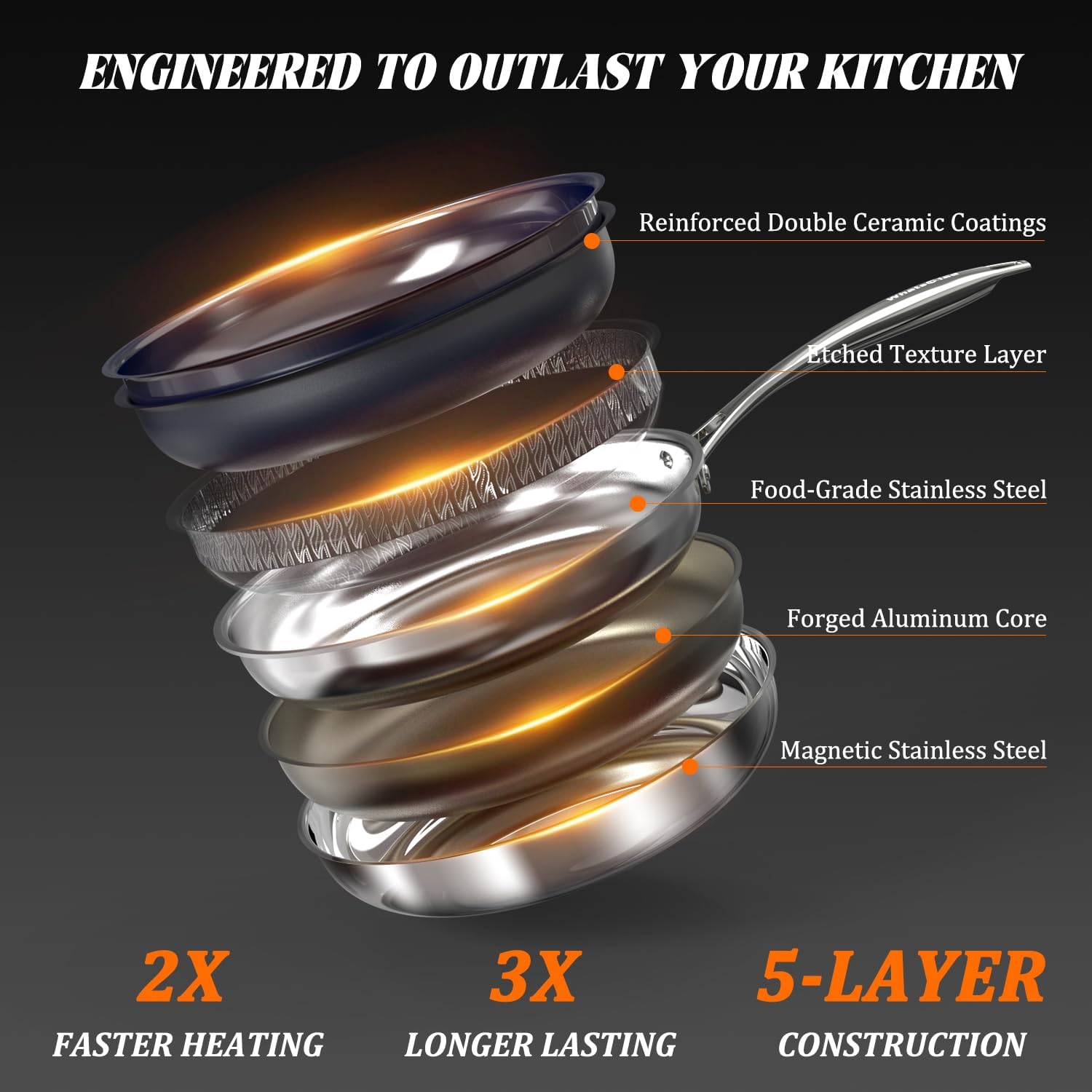 - Rapid & Even Heat Distribution: Built with a fully clad, hybrid 3-ply stainless steel core and 2-layer ceramic coatings, this frying pan heats up quickly and distributes heat evenly across the entire cooking surface. The inner aluminum core is sandwiched between two layers of stainless steel, eliminating hot spots. Perfect for searing a steak to a crust while locking juices inside or cooking an evenly-cooked, delicate omelet