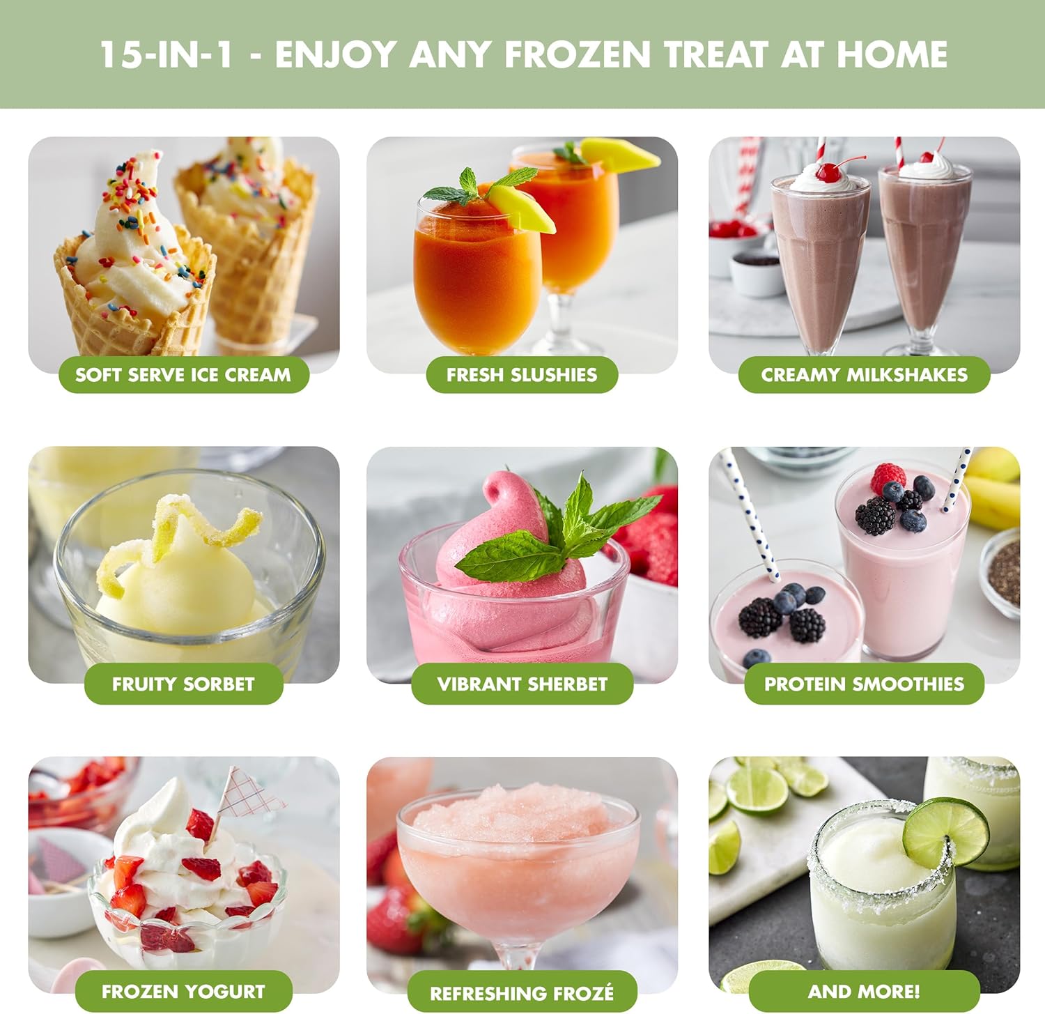 - MAKE IT ALL – 15-IN-1 DESIGN: Frost lets you create everything from classic soft serve ice cream and refreshing slushies, frozé, milkshakes, smoothies, protein shakes, frozen yogurt, dairy-free/vegan ice cream, custard, sorbet, sherbet, frozen cocktails, mocktails, and more for endless possibilities at your fingertips.