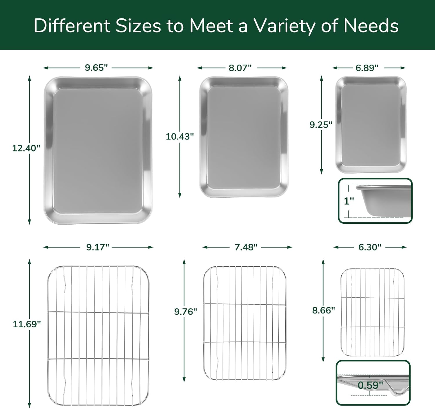 - 𝗖𝗼𝗺𝗽𝗹𝗲𝘁𝗲 𝗕𝗮𝗸𝗶𝗻𝗴 𝗦𝗼𝗹𝘂𝘁𝗶𝗼𝗻 🍀 Bofolai baking sheet Set includes three baking sheets (9.25” x 6.89”, 10.43” x 8.07”, 12.4” x 9.67”) plus three perfectly matched cooling racks, covering all your baking, roasting, and cooling needs.