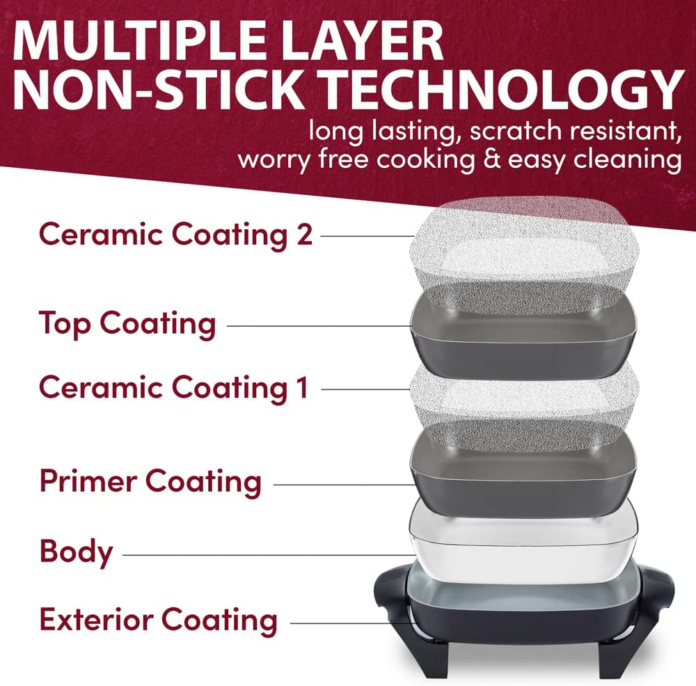 Elite Gourmet EG2212X 12"x12"x2.15” Ceralast™ PFAS Free Ceramic Electric Skillet, Dishwasher Safe, Rapid Heat Up, 1200W, Dark Grey