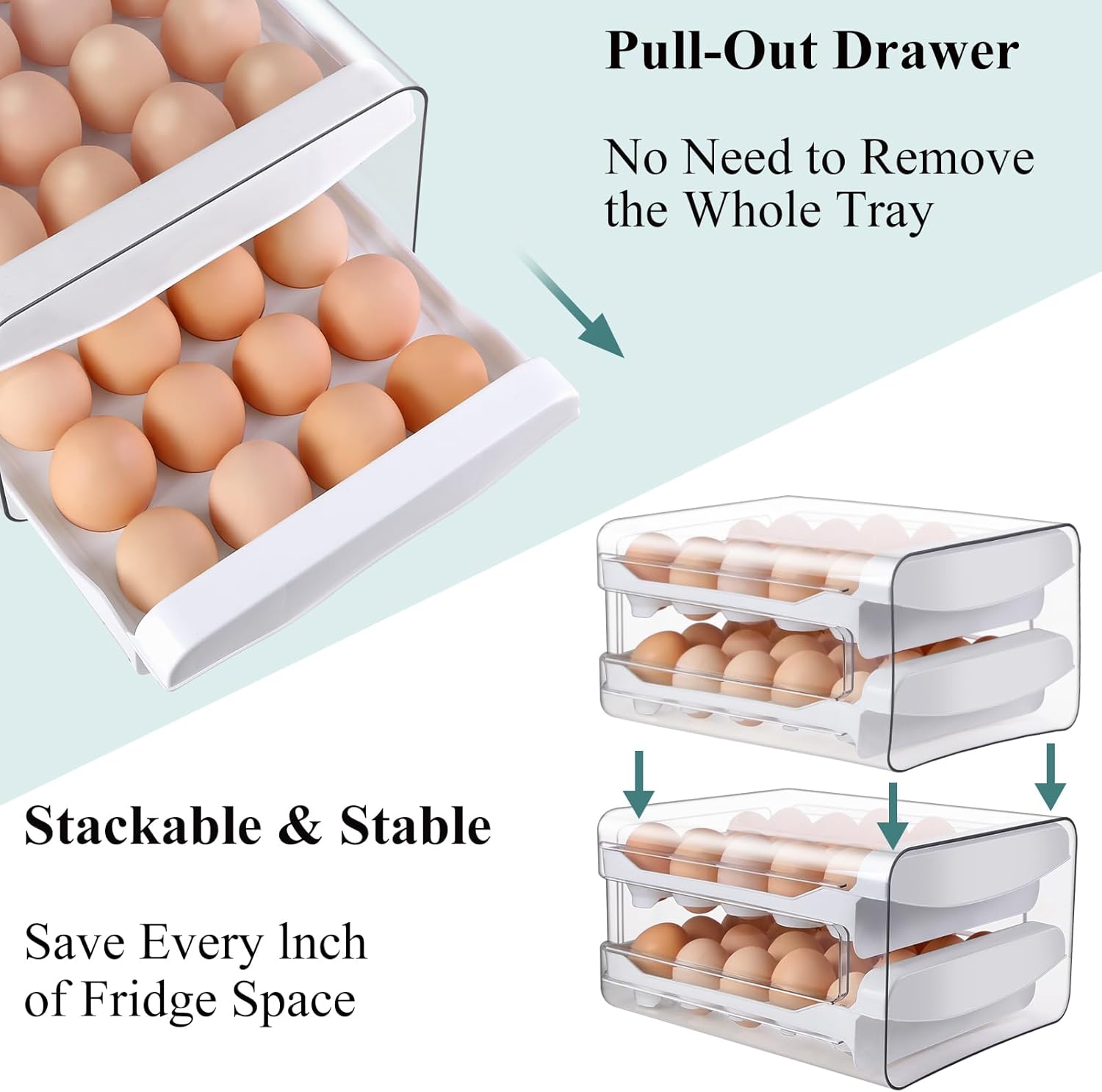 - 【40-Egg Large Capacity – Ideal for Families】 Features a space-saving two-layer design that holds up to 40 eggs in total—20 eggs per drawer. Perfect for families, home bakers, or anyone who buys eggs in bulk.