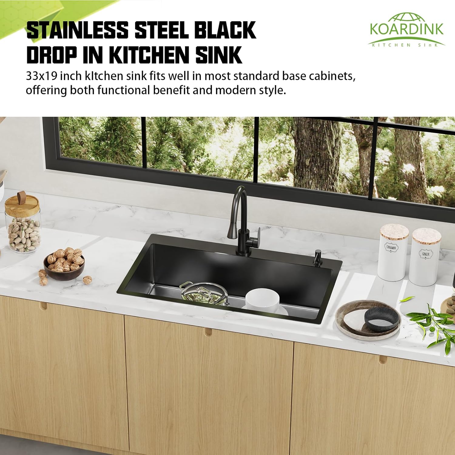 - Stainless Steel Sink: With exterior size-33"x19"x9", interior size 31"x15"x9", drop in black kitchen sink provides ample space for washing large pots, pans—streamlining meal prep and cleanup in both home and commercial kitchens. Stainless Steel kitchen sink combines a spacious, easy-to-clean work area with a footprint that fits most standard base cabinets.