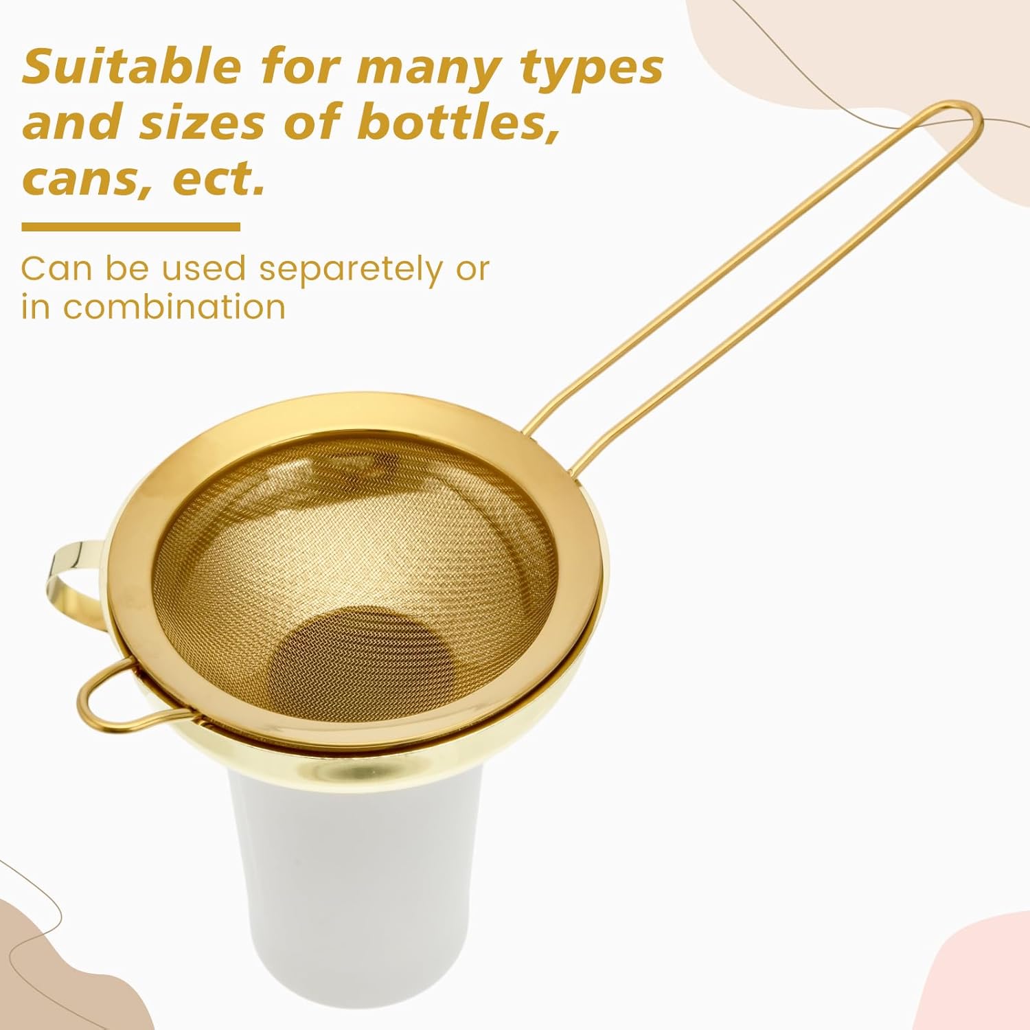 Boao 4 Pieces Stainless Steel Funnels with Fine Mesh Strainer, Household Kitchen Canning Funnels with Stainless Steel Colander (Gold)