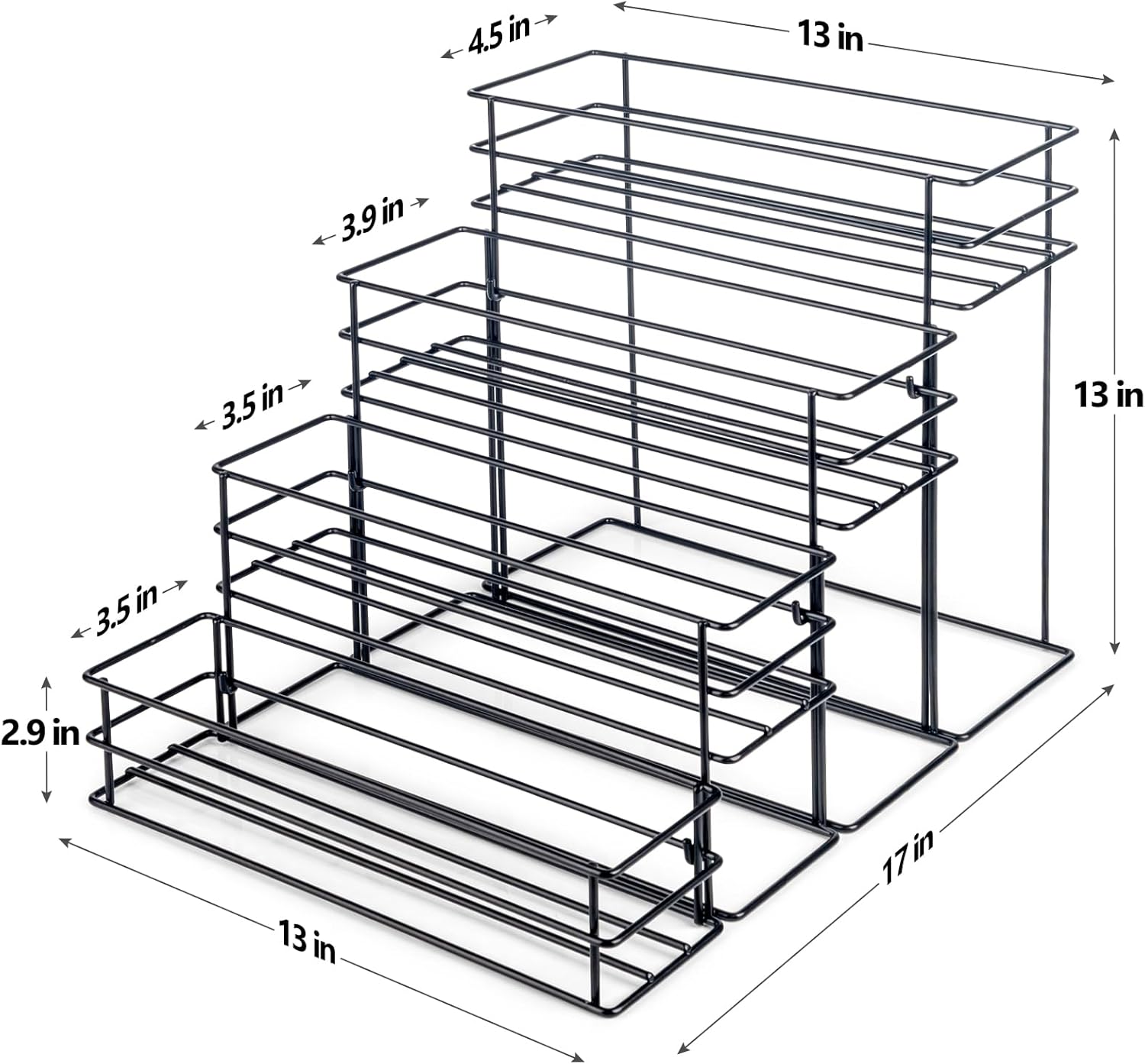 - 【Large-Capacity Coffee Bottle Stand】☕Do you have many flavored coffee syrups? Are you tired of rummaging through coffee bar cabinet for coffee syrup bottles? Our 12 bottles coffee syrup rack for coffee bar decor is the perfect solution for organizing and displaying your coffee syrups. .Its dimensions of 13''L x 17''W x 13''H and each tier approximately 3.5" wide.Features a stepped design to keep the items on the shelf at a glance and saves space.