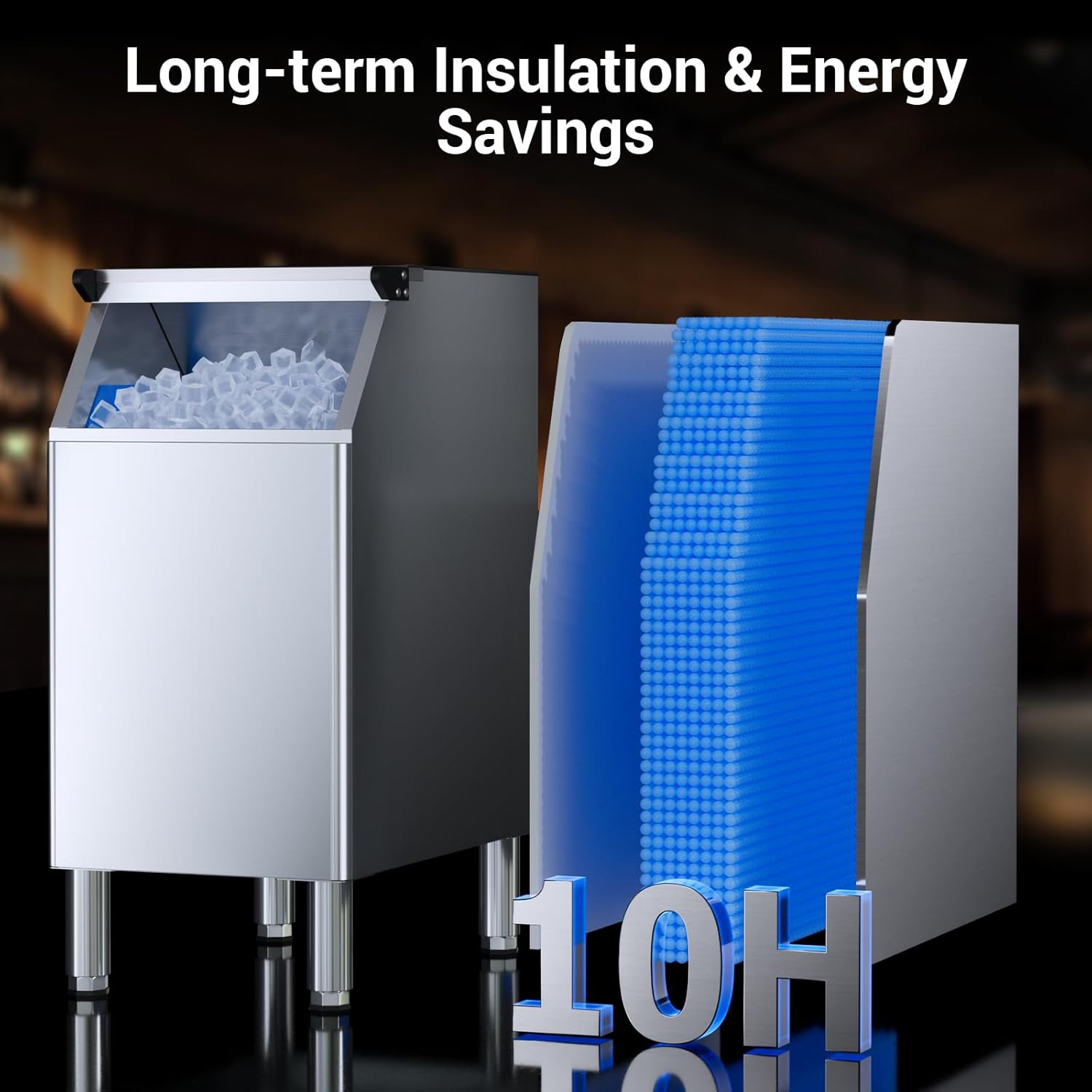 - Large Storage Capacity: The ice maker machine boasts an extra-large storage bin capable of holding approximately 450 pounds of ice. Equipped with effective insulation, this bin safeguards the ice for up to 12 hours. Constructed with three layers of materials—stainless steel shell, thickened polyethylene insulation foam, and food-grade PP—the bin ensures optimal protection, insulation, and hygiene for your ice supply.
