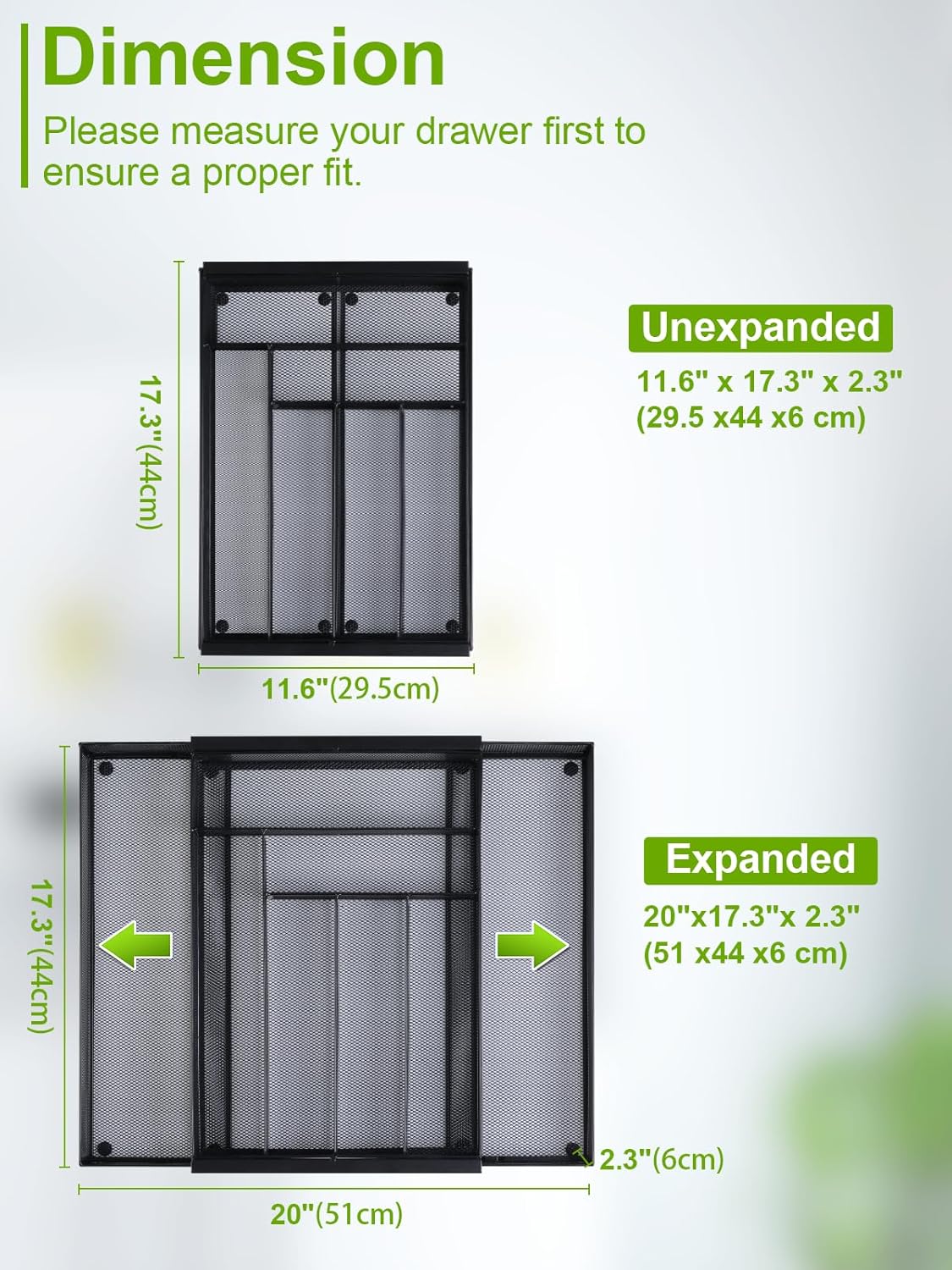 - Stay Organized:This Metal Silverware Organizer Features 7 Deep Compartments That Allow You to See Everything at a Glance—No More Clutter! The Space-Saving Design Helps You Find What You Need Quickly, Whether It's Your Favorite Knife or Spoon. Measure Your Drawer First! Minimum Drawer Size Need 11.7"*17.4”.