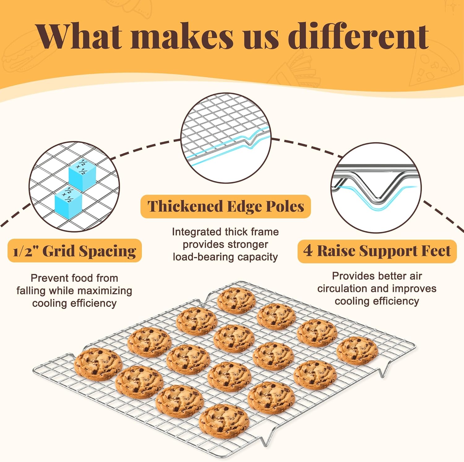 - STURDY STAINLESS STEEL CONSTRUCTION: Our baking cooling rack is made of quality materials, prevents bending or deformation when carrying heavy loads. Smooth polished surface of cookie cooling rack without coating or plating, no burrs, no rust, no peeling, protect your daily food safety