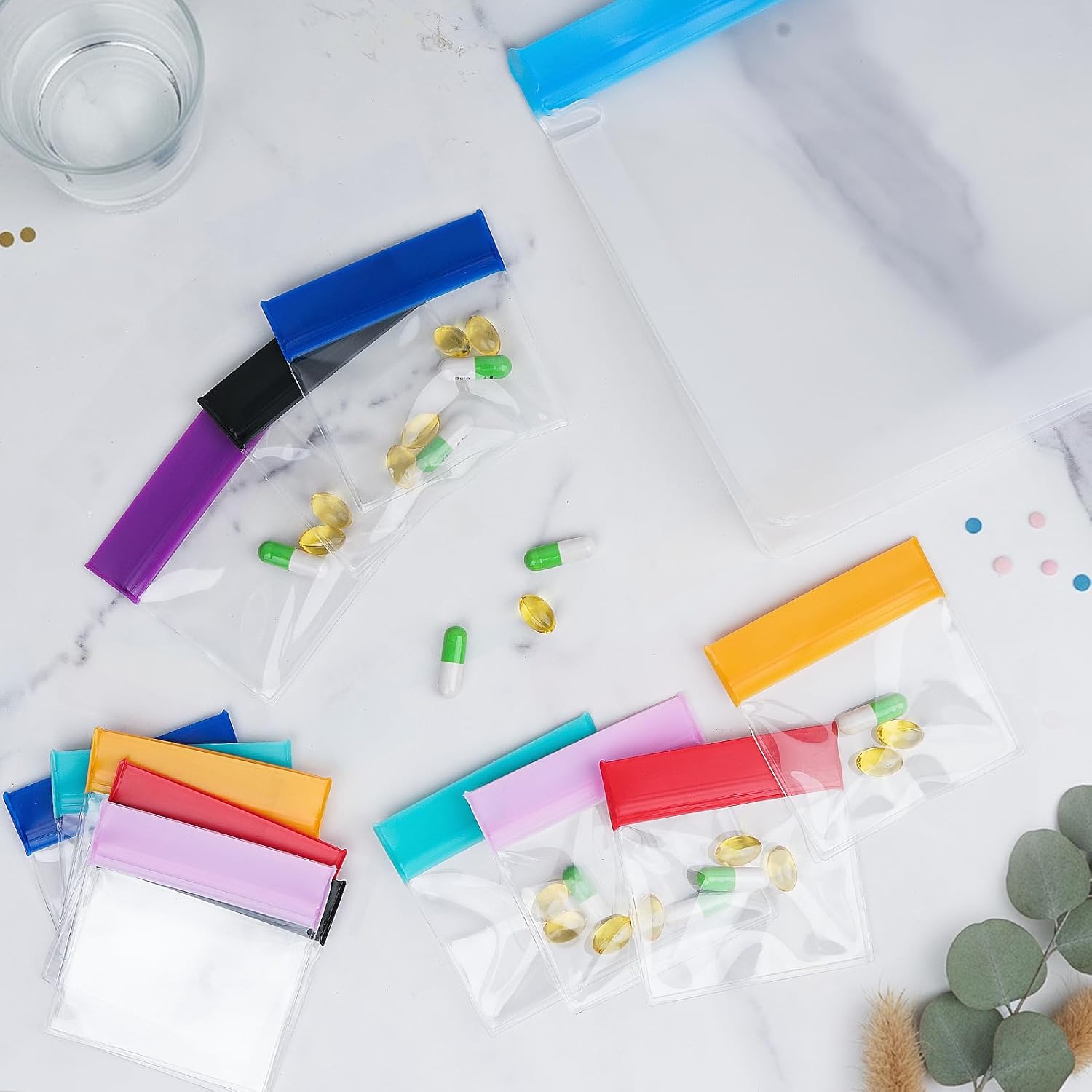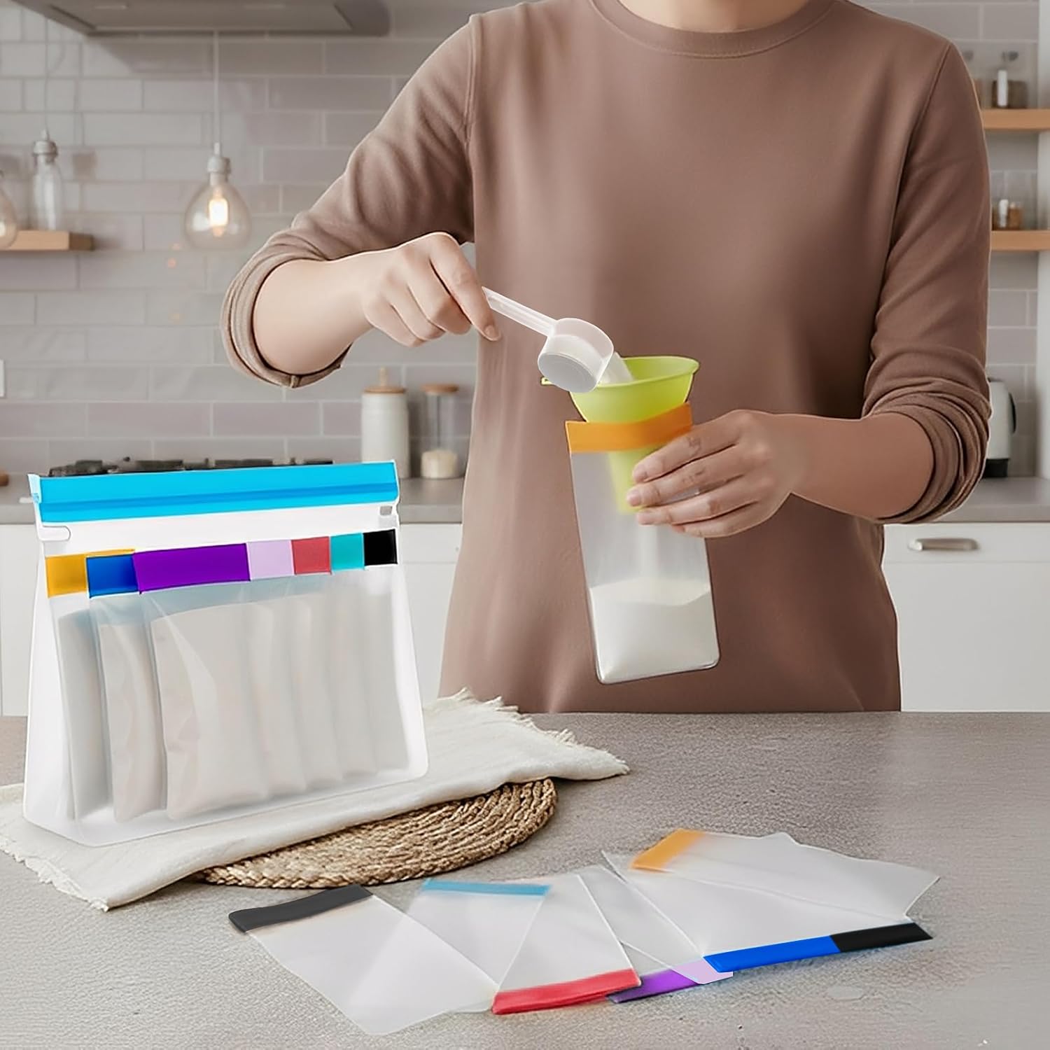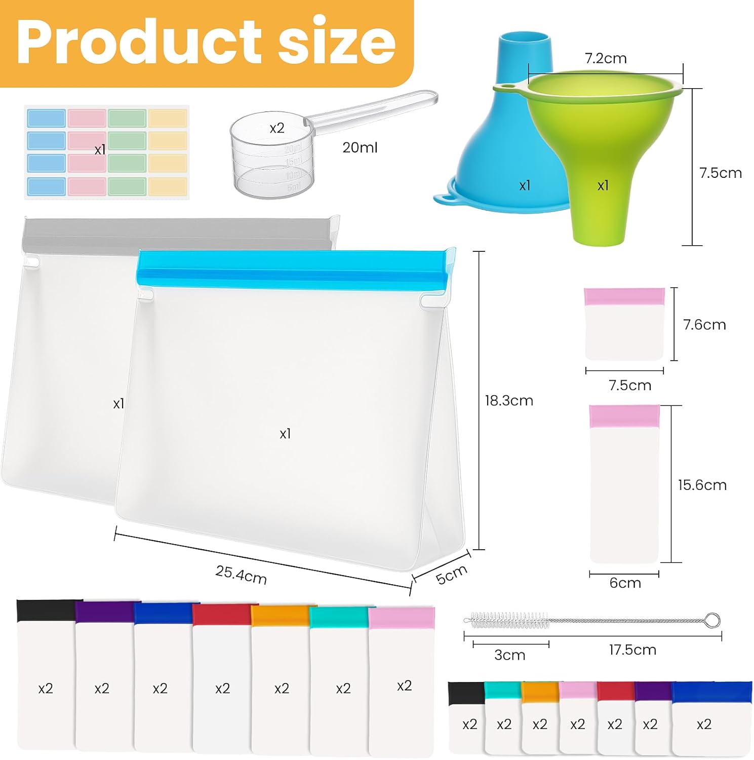 - [Precision Portion Control System] Includes 14 pre-portioned pouches:7 Colors × 2 Single-Dose (6×15.6cm/2.36x6.14in, holds 30-40g powder).7 Colors × 2 Small Pouches (7.6×7.6cm/2.9x2.9in, for snacks/supplements/pill). Color-coding prevents flavor mix-ups during trips