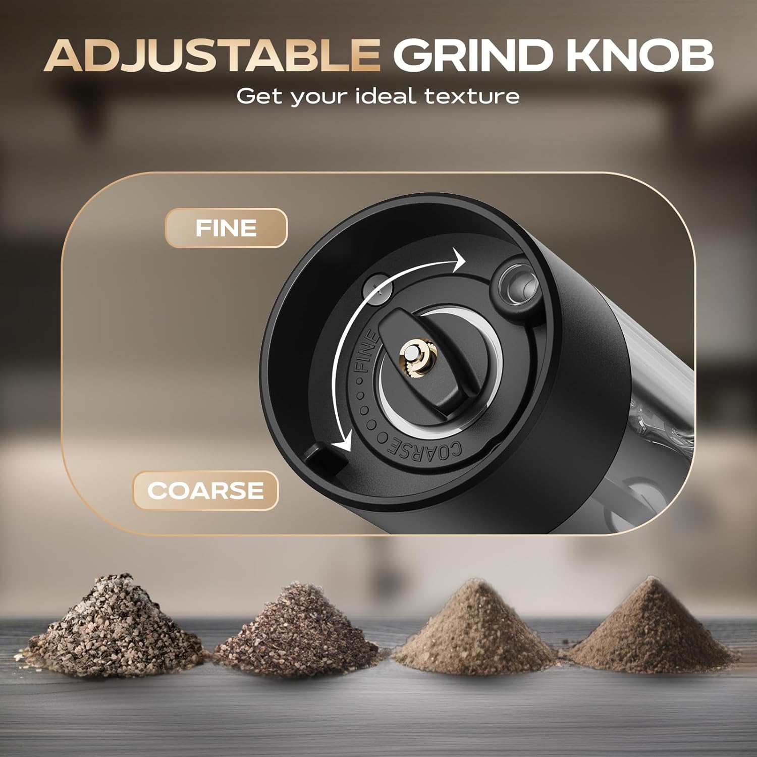 - 【Rechargeable Battery】Skip the disposable batteries. Our electric salt and pepper grinder comes with a long-lasting rechargeable battery that powers 500+ grinds per charge, plus a built-in charging indicator and included 2 Type-C cable for easy recharging