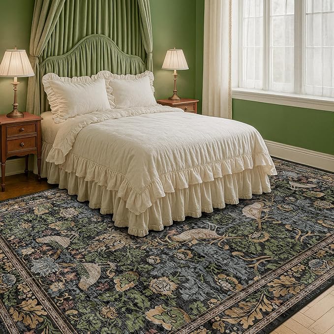 - Vintage Elegance: Enrich your home with our rug’s refined blend of charcoal, olive, and slate tones. The intricate floral, bird, and plant motifs reflect a Victorian - inspired maximalist charm, blending farmhouse warmth with timeless flower patterns—a perfect statement piece for any room seeking vintage depth and character.