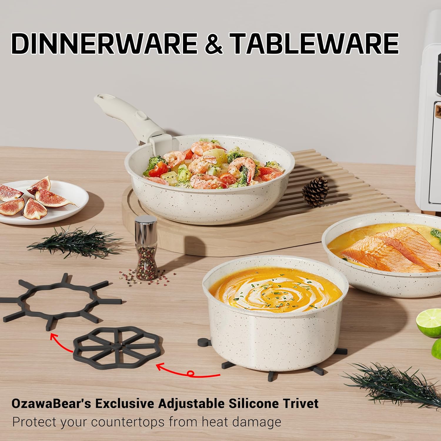 - Functional Cookware Set: Use as tableware, bakeware, dinnerware, grill pans, or fridge storage (with lid). Includes OzawaBear's exclusive adjustable silicone trivet to protect your countertops from heat damage.