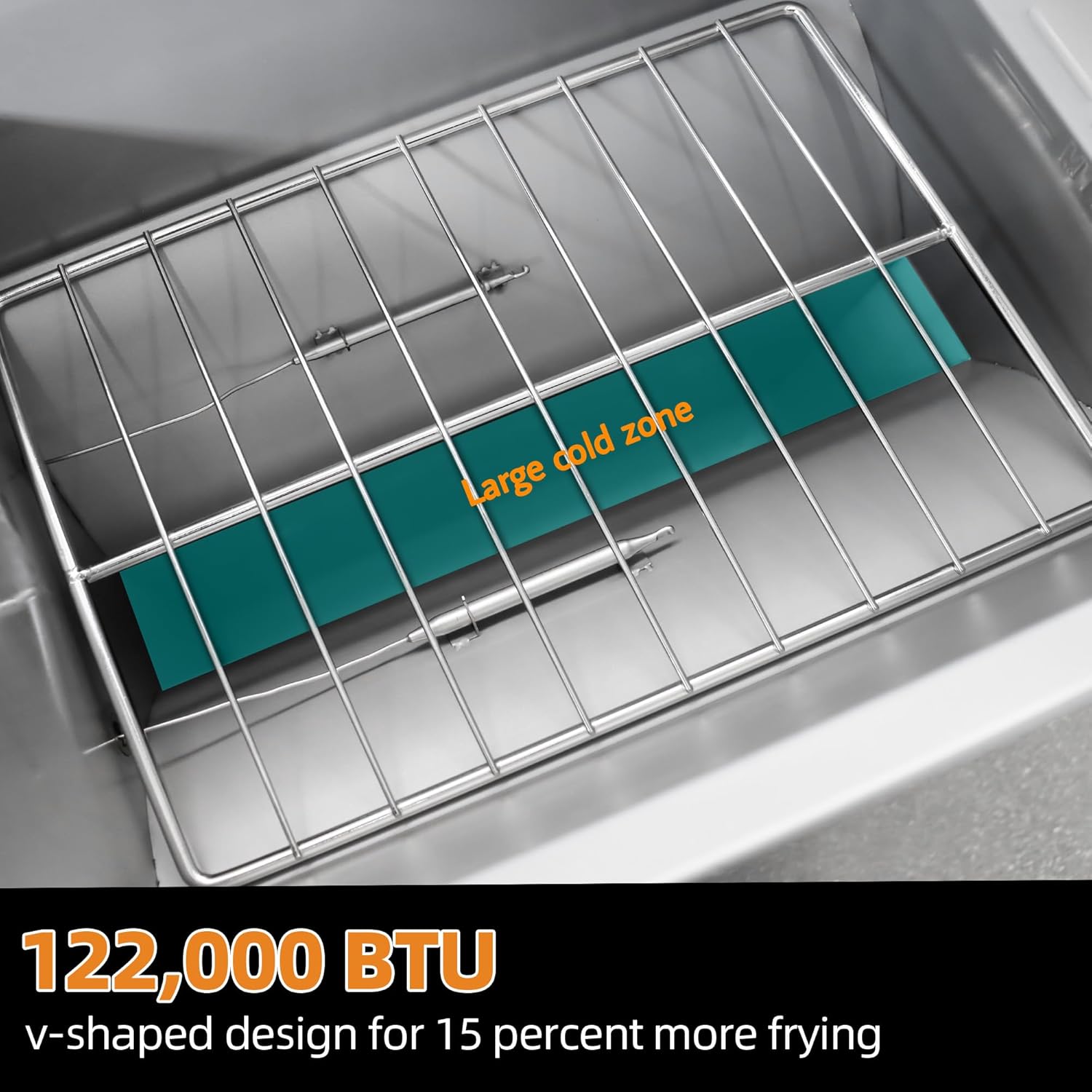 - Rapid Drain & Ultra-Efficient Heating:Boost productivity with fast draining (90-second oil evacuation) and intense 122,000 BTU heating that slashes preheat time by 50%. The floor-standing design’s flame-to-plate system encircles the pot for uniform cooking, while the full port valve ensures zero residue. CSA-certified and NSF-ready for food trucks needing reliability—fry faster, clean smarter!