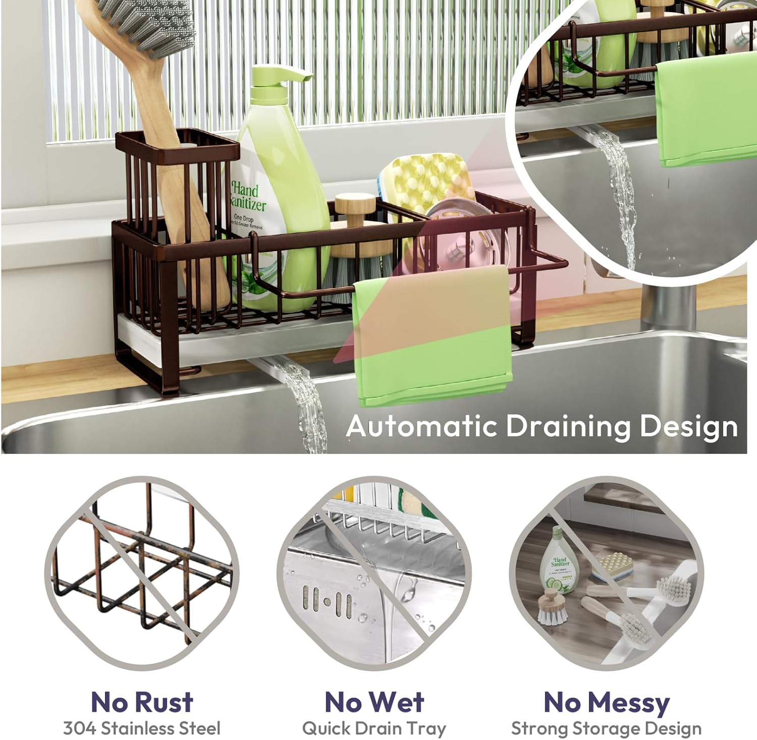 - [Large Storage Space Kitchen Essentials]: Our kitchen sink caddy organizer will give you a neat and clean kitchen for its strong storage capacity. Soap holder can hold three brushes, one rubber plug and a sponge, one bottle of soap dispenser-no swinging and no falling