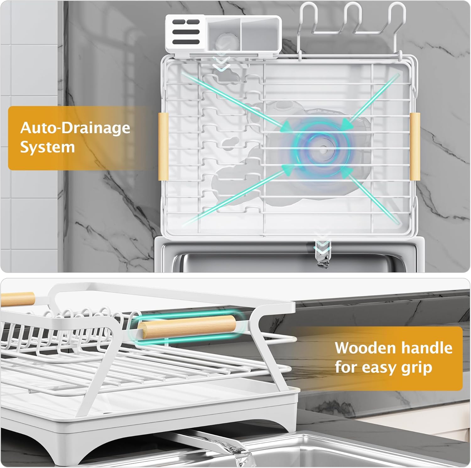 Epicano Dish Drying Rack for Kitchen Counter,Space-Saving Dish Rack,Rustproof Dish Drainer with Utensil Holder and Knife Slots for Sink,Kitchen Drying Rack with Wooden Handle and Cup Holder,White