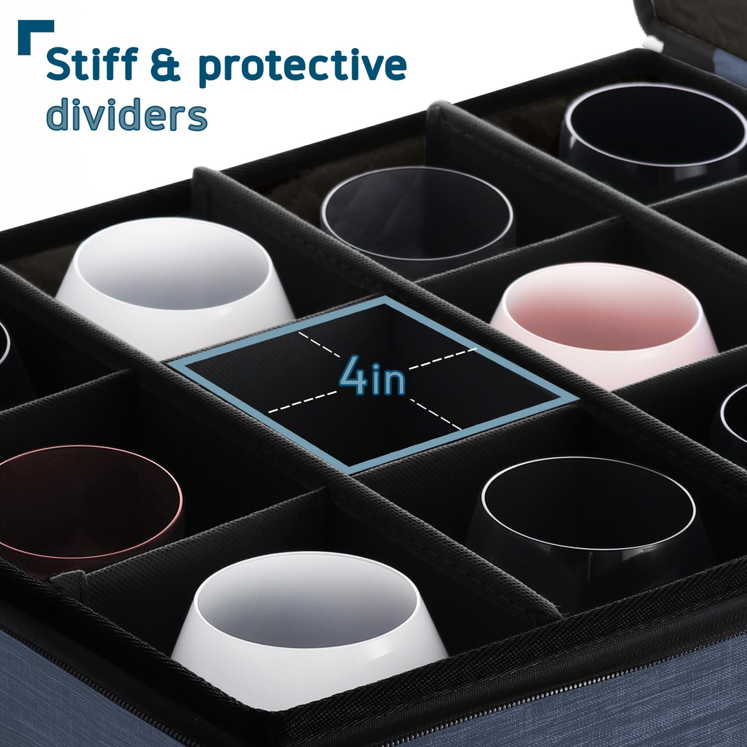 - Fits Up To 12 Cups: Each wine glass storage box with dividers fits up to 12 cups in the 4-inch inner slots. Dimensions: 12.5” x 16” x 10”.