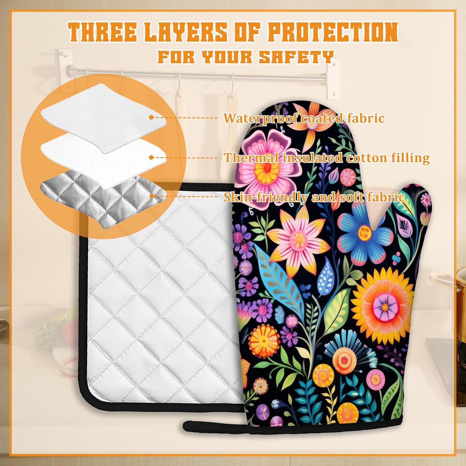 Vintage Hippie Flower Oven Mitts and Pot Holders,Heat Resistant Oven Mitts Gloves and Pot Holder for Home Kitchen Decorations Cooking Baking BBQ Gifts,Set of 4
