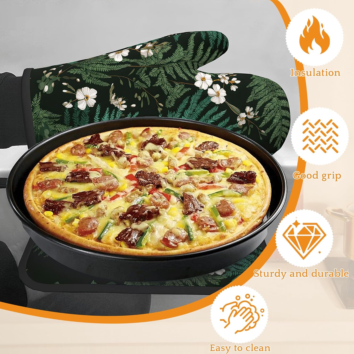 Herbal Fern Flowers Oven Mitts and Pot Holders Set,Kitchen Decor Heat Resistant Non Slip Hot Pads and Oven Mitt for Chef Cooking Baking BBQ Mom Girl Gifts(4 Piece Set)