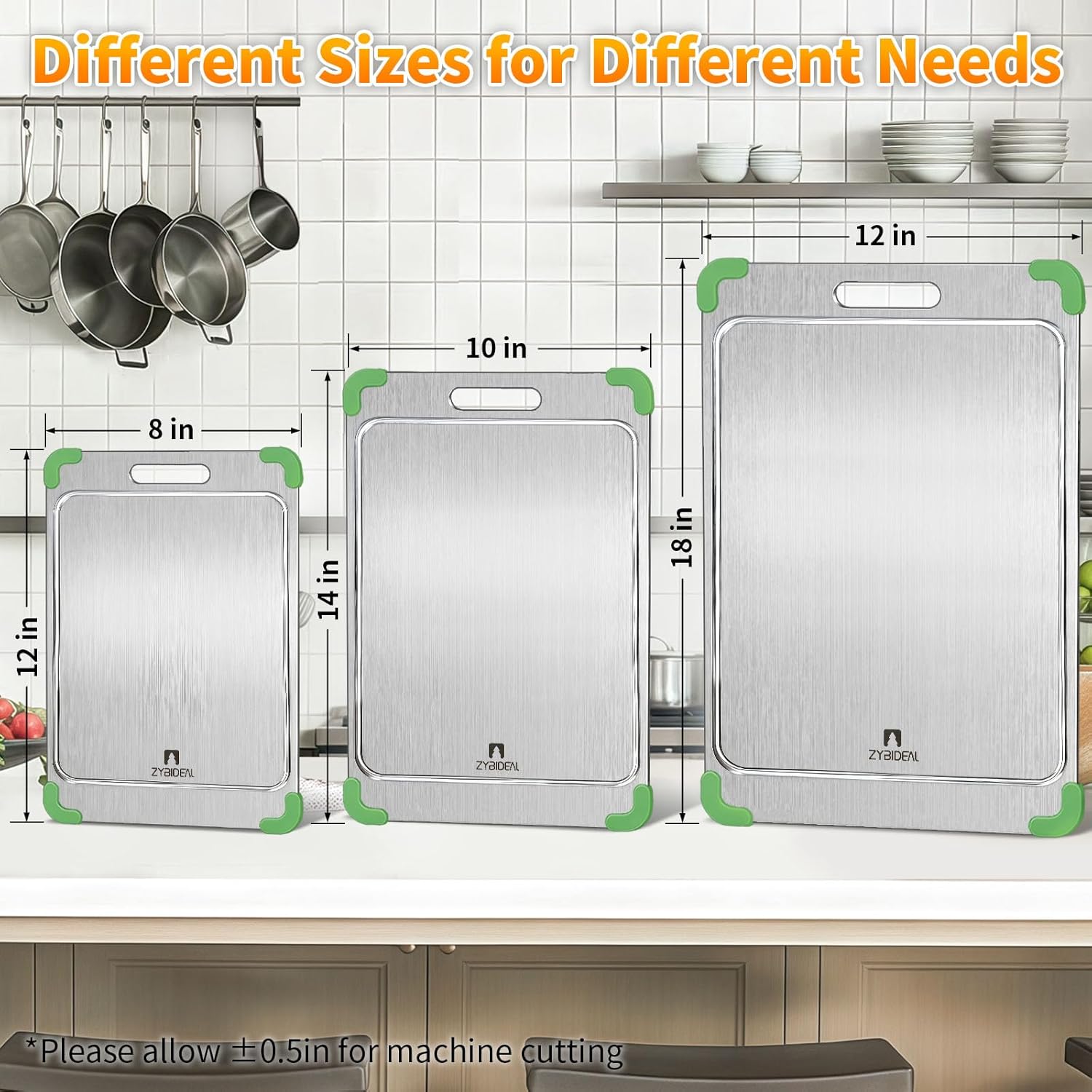 3Pcs 100% Pure Titanium Cutting Board with Grooves, Update Double Side Titanium Chopping Board, Silicone Anti-slip Stainless Cutting Boards Set for Kitchen, Green
