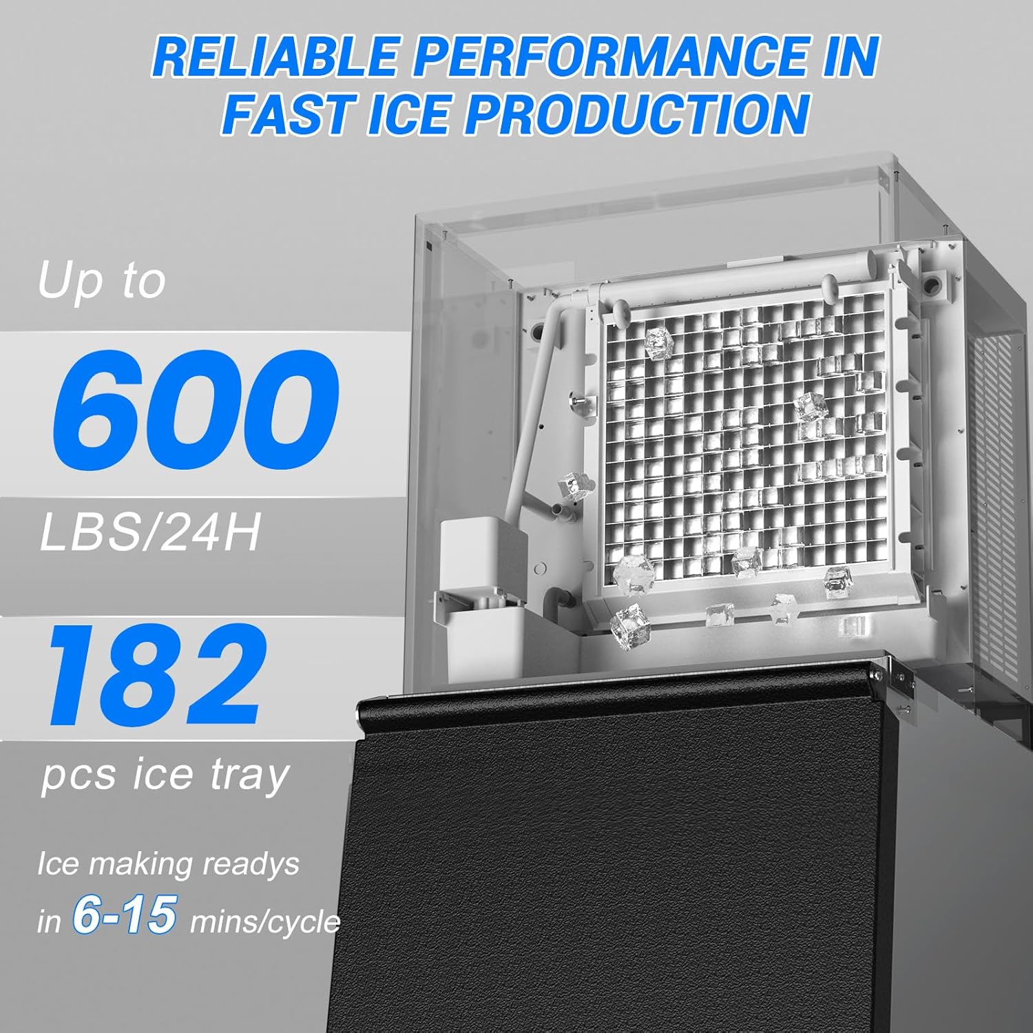 Commercial Ice Maker Machine 650LBS/24H with 350LBS Ice Storage Bin – 182 Cubes per Cycle in 6-15 Mins, Stainless Steel Industrial Ice Machine for Restaurants, Bars, Cafes & Business Use