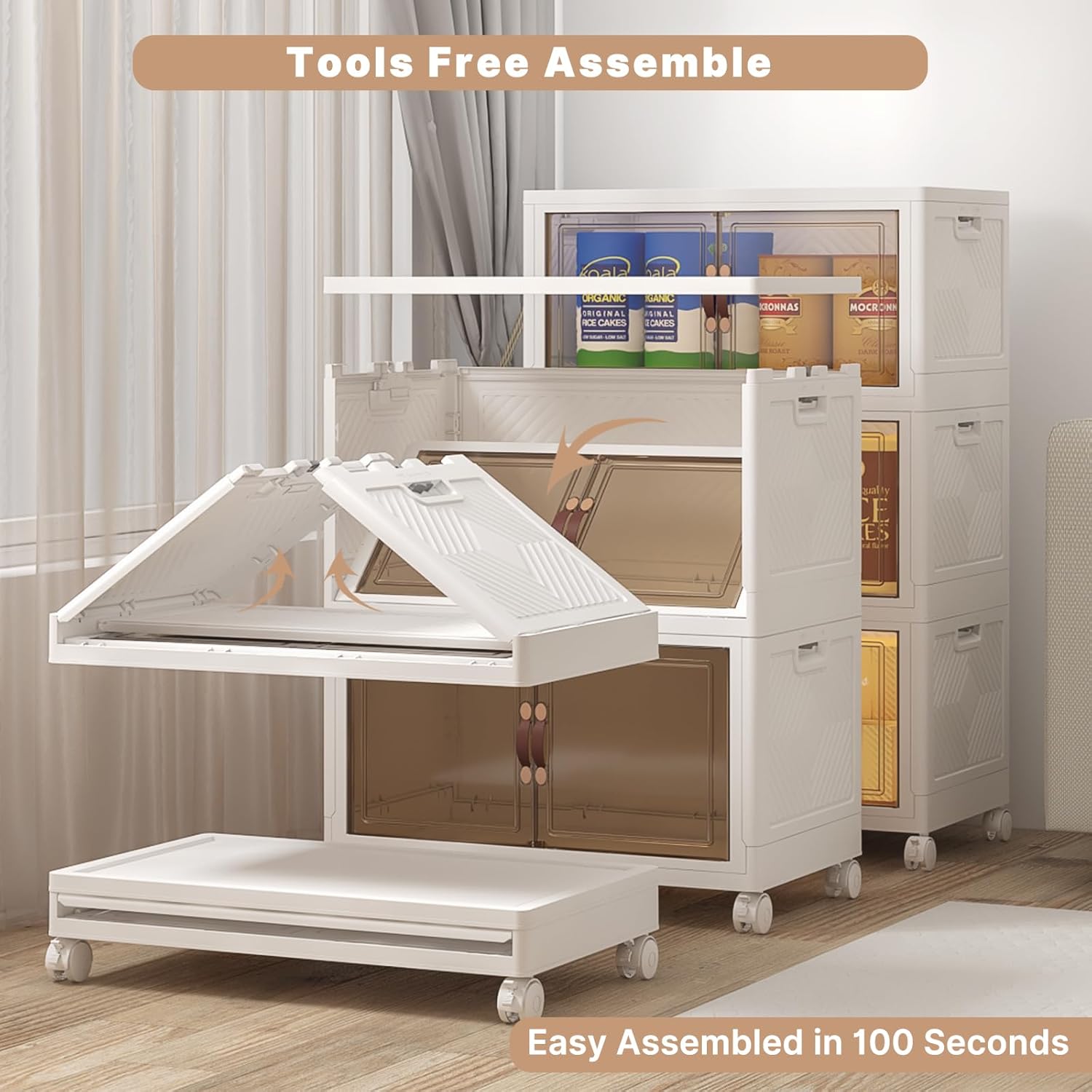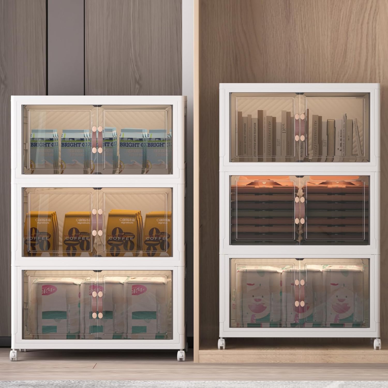 - EACH 2.6INCH FOLDABLE & TOOLS-FREE ASSEMBLY: Setting up these stackable storage bins with doors is quick and simple—NO TOOLS NEEDED. You can have them ready to use in just minutes.Easily fold down to JUST 2.6 inches each tiers when not in use. Especially when you want to move house, you don't need to move bulky cabinets and worry about them being damaged due to transportation. It is a good alternative idea to fixed furniture cabinets and small miscellaneous boxes!
