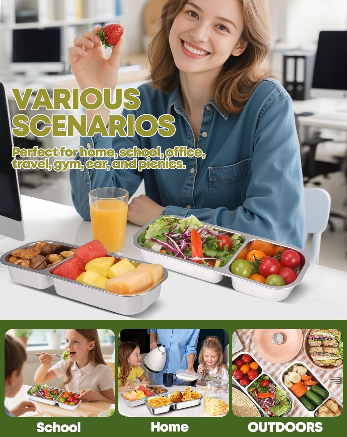 - 【Double Compartment Snack Containers for Smart Portions】 Designed with 2 compartments, these stainless steel snack containers keep snacks neatly separated—no mixing, no mess. Great for fruits and crackers, salad & dressing, or cheese & nuts. Perfect reusable snack containers for lunchable-style meals at school, office, or on the go.