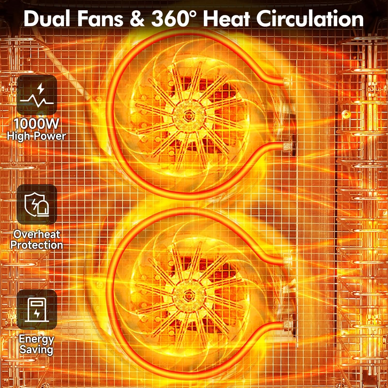 - Dual Fans - Even Heat Distribution: High-performance 1000W heating system heats up quickly, while dual upper and lower fans deliver powerful airflow, creating a three-dimensional heat circulation system for evenly heated food, ensuring a consistent texture.