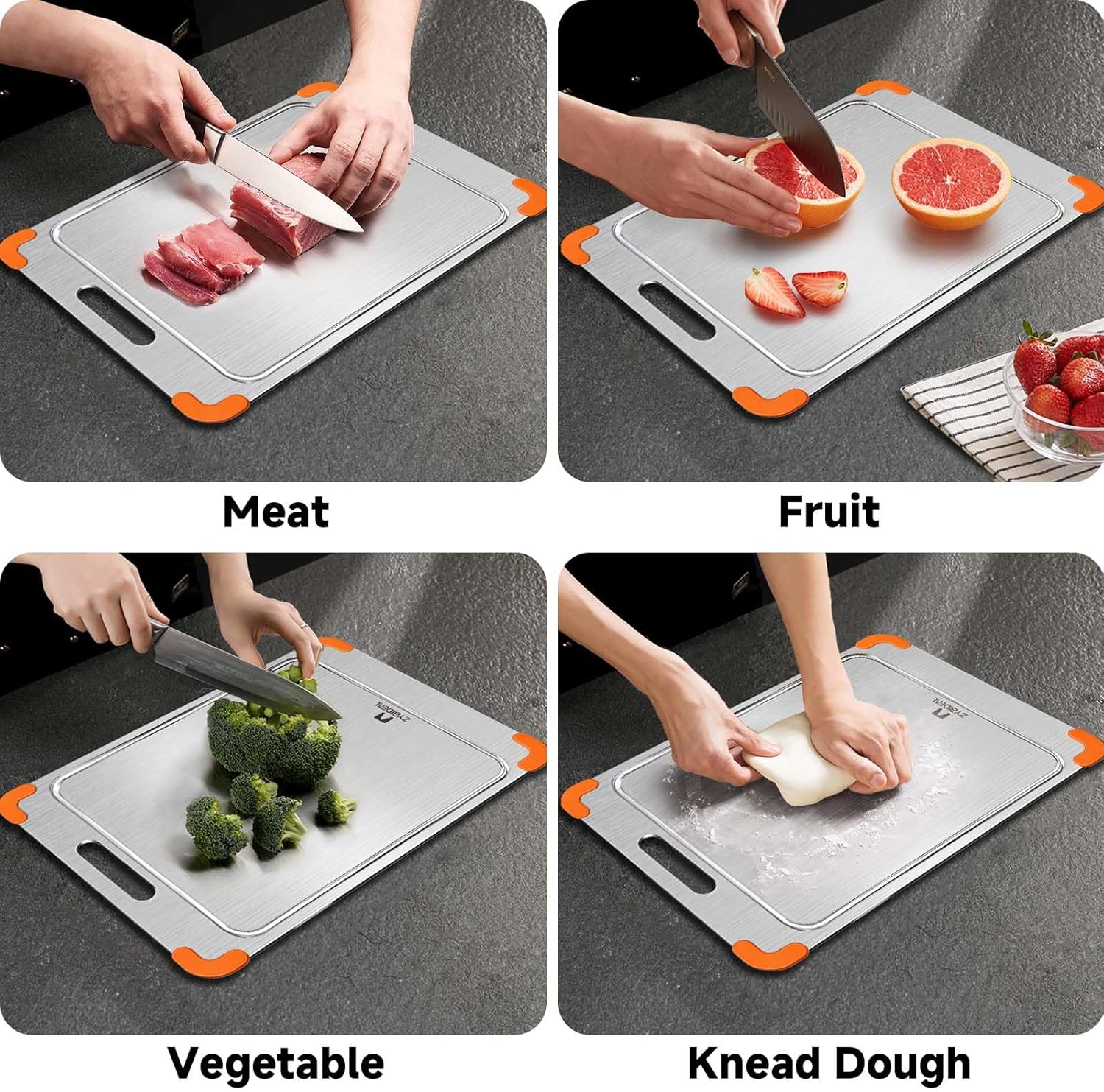 100% Pure Titanium Cutting Board with Grooves, Update Double Side Titanium Chopping Board, Silicone Anti-slip Stainless Cutting Boards for Kitchen 8 * 12 IN, Orange