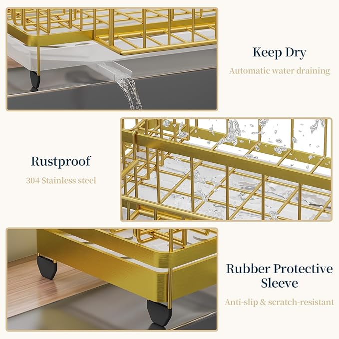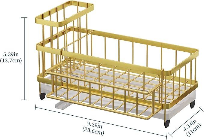 Consuemst Sponge Holder for Kitchen Sink - Auto Draining Sink Caddy Organizer with Detachable Rack, High Brush Holder, Kitchen Countertop Storage Accessories, Gold