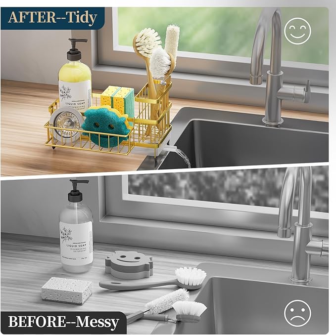 - [Dual Brush Stand Feature]: Built-in brush holder supports both long and short brushes vertically, saving space while keeping your tools accessible. This convenient sink sponge caddy design adapts to multiple brush sizes, ensuring no item is left out. Make your cleaning routine efficient and stylish with this multipurpose organization and storage upgrade for modern kitchens