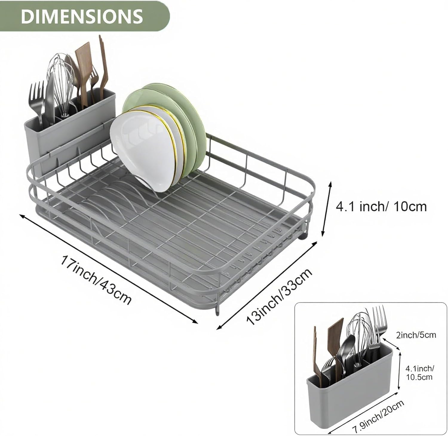 - 【Space-Saving Design】 The dish rack measures 17" x 13" x 4.1", it can hold up to 10 plates, 10 bowls, 4 cups/mugs and cutlery. Keeping your countertops clutter-free while maximizing kitchen space. Ideal for small to medium-sized kitchens.