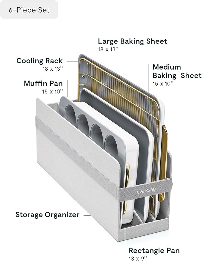 - WHAT'S IN THE BOX: Included in this 5-piece bakeware set is a 18x13" baking sheet, 10x15" baking sheet, 12 cup muffin pan, 9x13" rectangle pan, and 1 storage organizer.