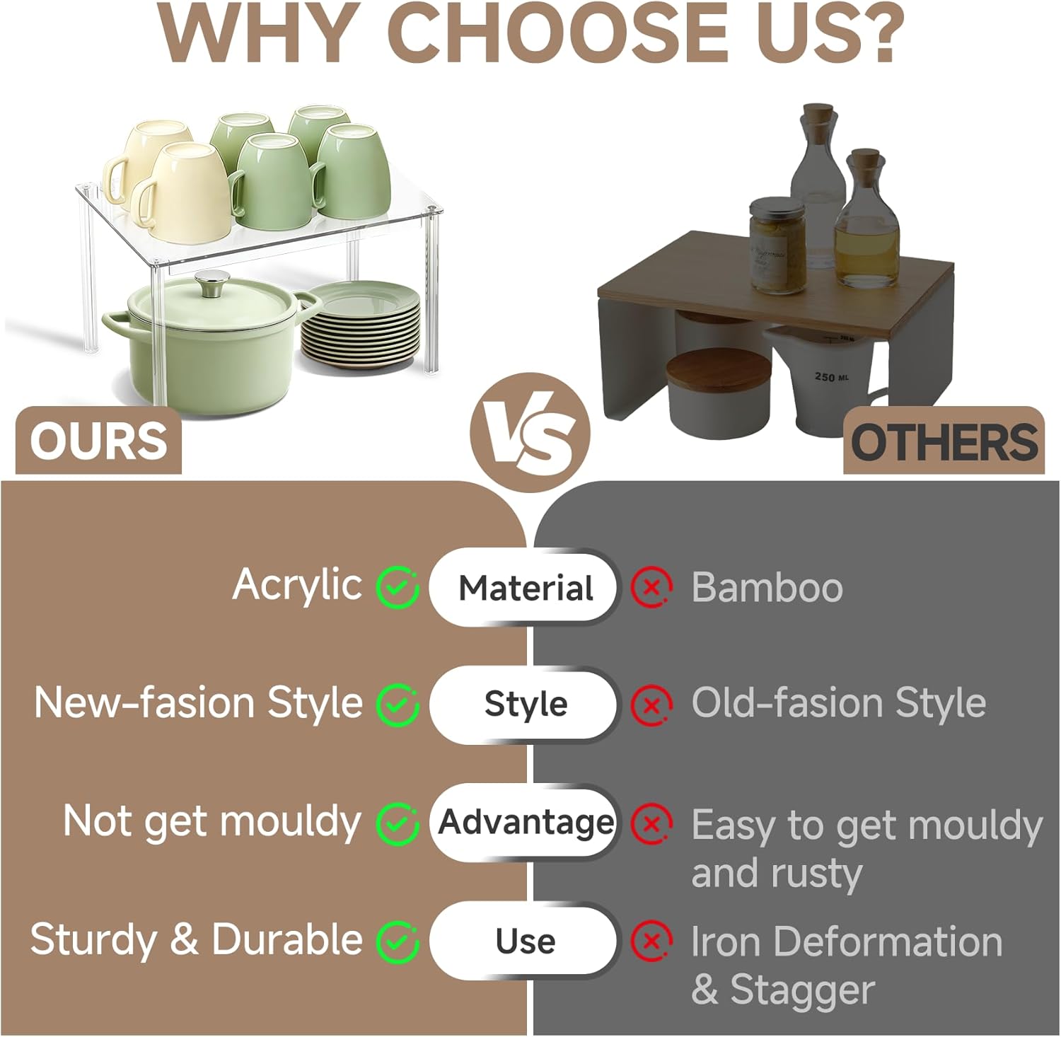 - 【DOUBLE LAYER STORAGE - MAXIMIZE YOUR KITCHEN CABINET ORGANIZER!】Do you often fret about clutter and wasted space in your cabinets? The new cabinet organizer can neatly store kitchen essentials such as spice, plate, mug, jars, dish, and coffee cup on top and bottom of cabinet shelf, making it ideal for condiment storage or as a countertop organizer display riser — Try this double-layer spice rack!