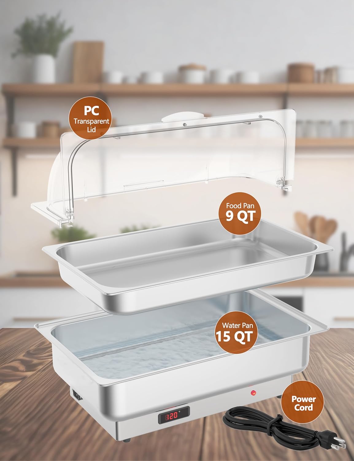 - 【Food Grade Stainless Steel & Roll PC Lid】Warming trays for buffets party is made of food grade stainless steel with a 1/1 NSF-certified food pan. PC lid is made of non-toxic and PC material.