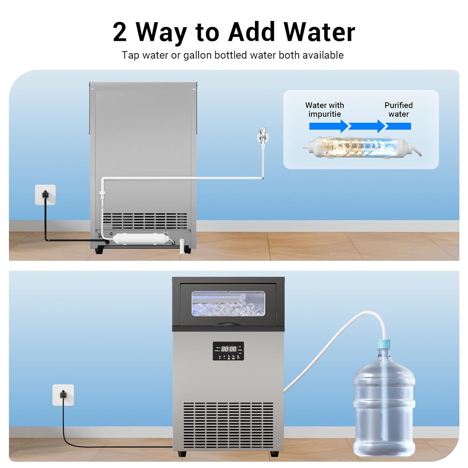 - Dual Water Inlets & Space-Saving Design: Offers flexible water supply options—connect to tap water or manually top it off. Its compact footprint (19.7"W × 15.8"D × 31.5"H) fits under counters or freestanding, making it perfect for tight spaces like offices, bars, or home kitchens.