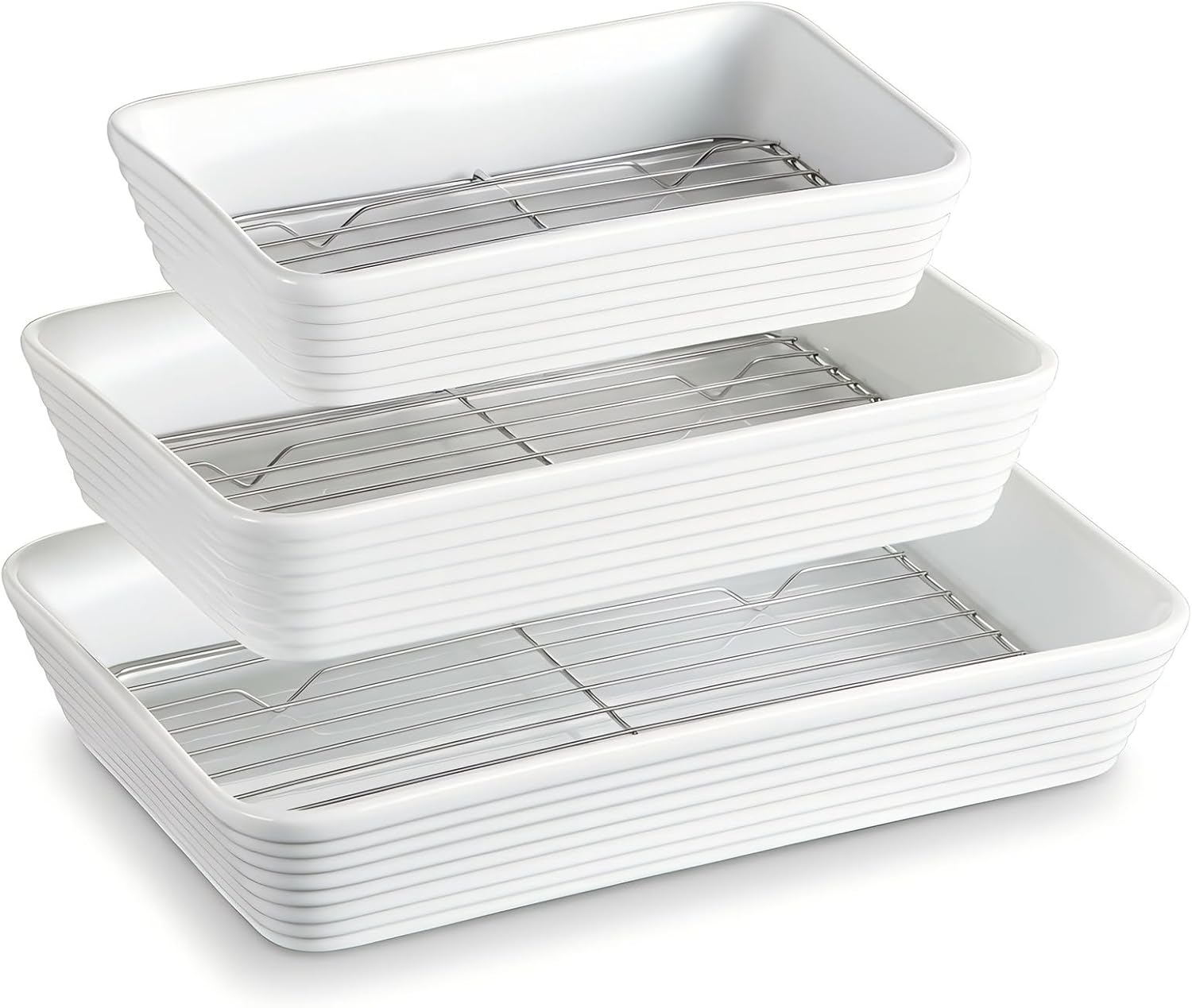 ONEMORE Casserole Dishes for Oven, Ceramic Baking Dish Set of 3 with Roasting Racks Rectangular Large Deep Lasagna Pan without Handles Porcelain Baking Pan with Rack for Oven Cooking (3QT/2.1QT/1.3QT)