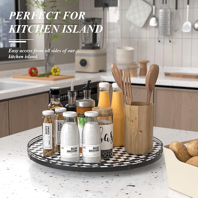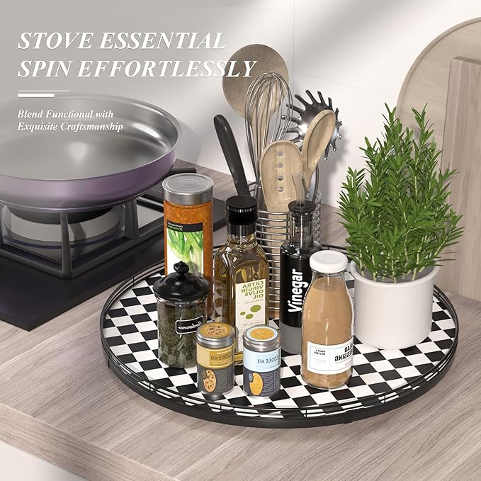 - CLASSIC BLACK AND WHITE CHECKERED DESIGN: A stylish black and white kitchen decoration plate with a sturdy iron frame, seamlessly blending with your black and white kitchen things to elevate your home decor. Perfect as a large decorative lazy Susan, a kitchen table centerpiece, or a table kitchen caddy, bringing both function and charm to your tabletop.