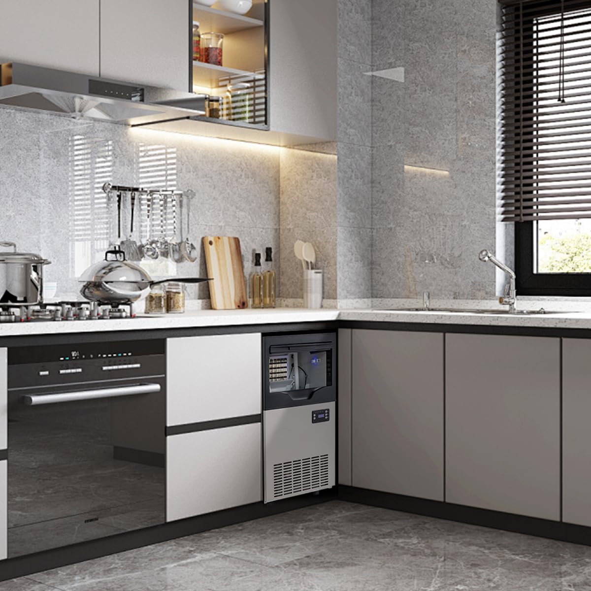 - Premium Design: Constructed from durable stainless steel, significantly enhancing its durability, sturdiness, and lifespan. The freestanding ice maker is easy to install, with dimensions of 15.15 x 15.74 x 28.34 inches and a weight of 47.4 pounds. It is equipped with four adjustable feet to prevent the ice maker from coming into contact with damp surfaces