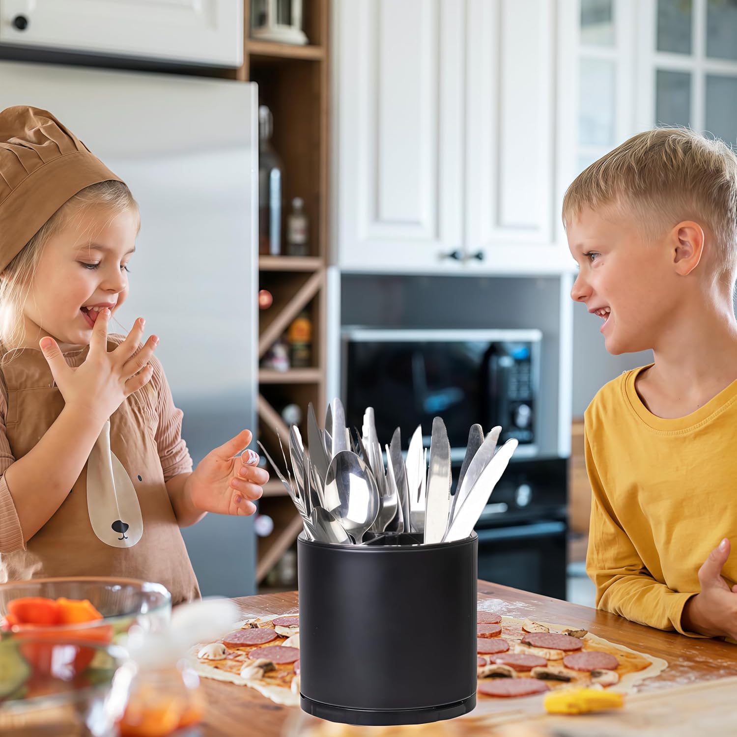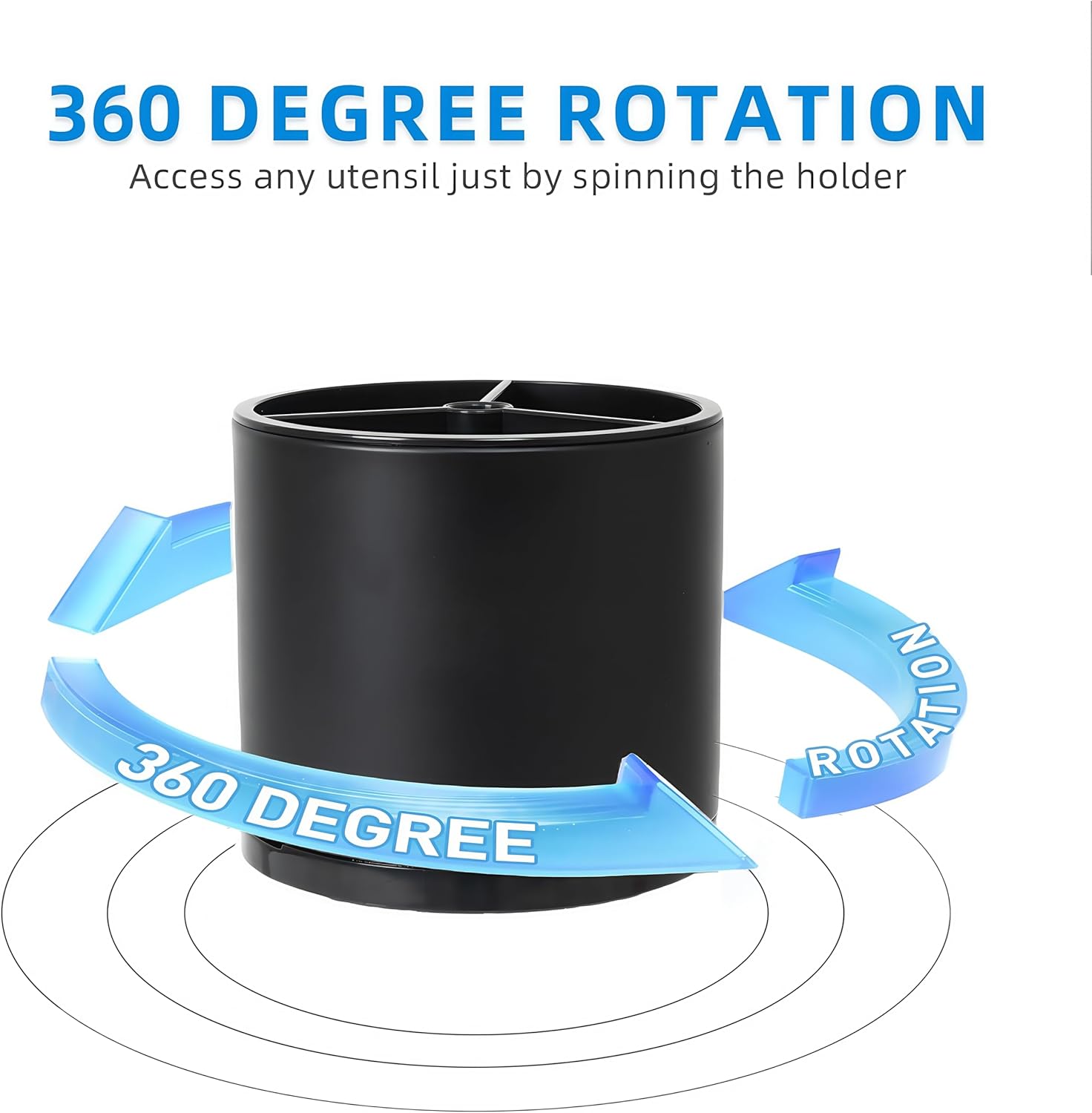 - 360° Rotating Utensil Holder: The 360° utensil caddy with rotating design makes it silverware organizer are easy to use and also a great stress relieving companion in the kitchen.The base of the utensil caddy on the kitchen countertop is equipped with 4 non-slip rubber pieces to secure utensils and prevent scratching the kitchen surface. It provides a simple and efficient storage solution for all your kitchen utensils.