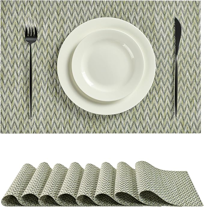 Leetaltree Green Placemats Set of 8 - Heat Resistant Non-Slip Place mats for Dining Table, Washable Durable PVC Vinyl Woven Table Mats(Green Zigzag, 8)