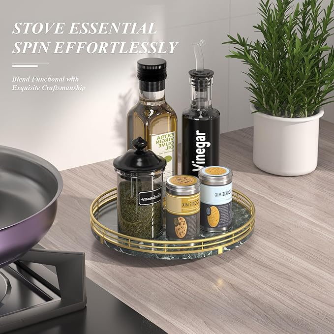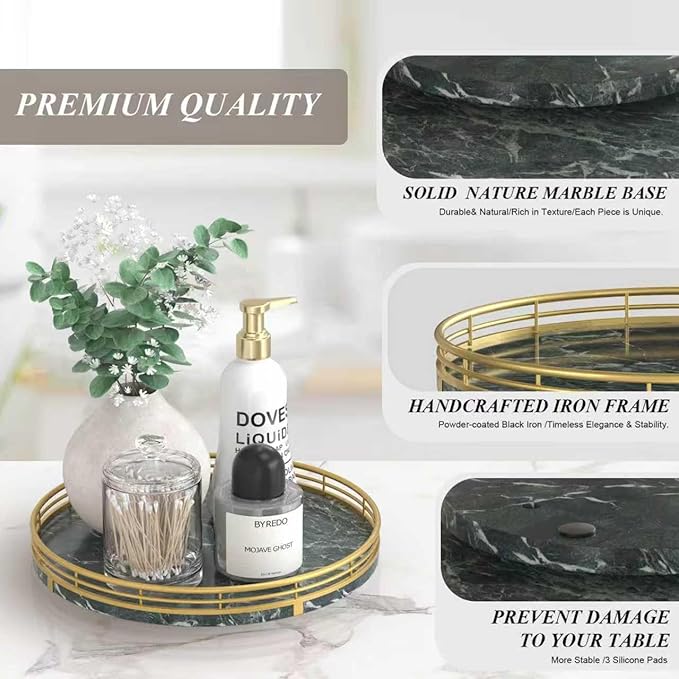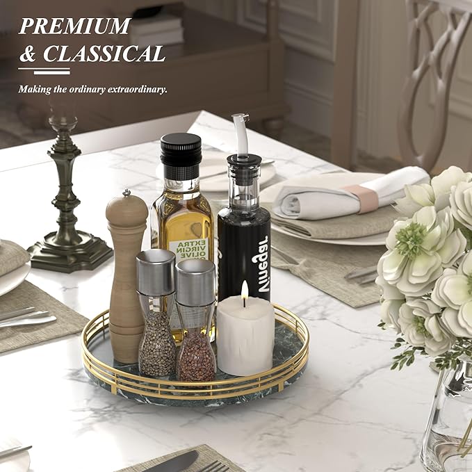- LUXURY & FUNCTIONAL DESIGN– The green marble tray combines natural marble texture with a modern gold frame, making it an eye-catching marble lazy Susan for dining table, vantity tray and a stylish addition to any home decor.